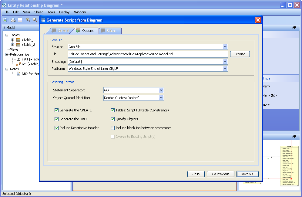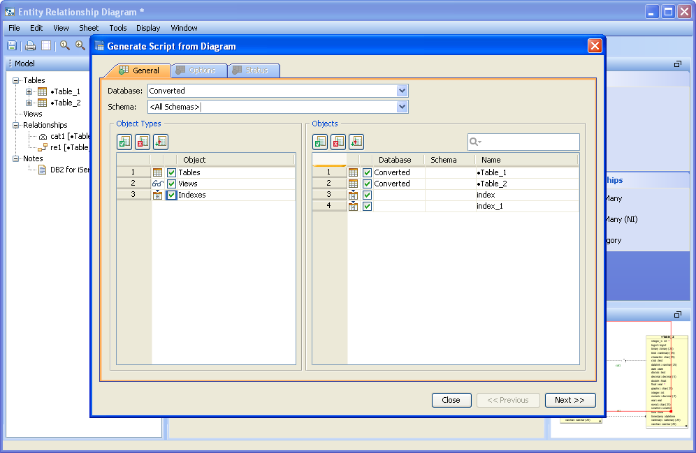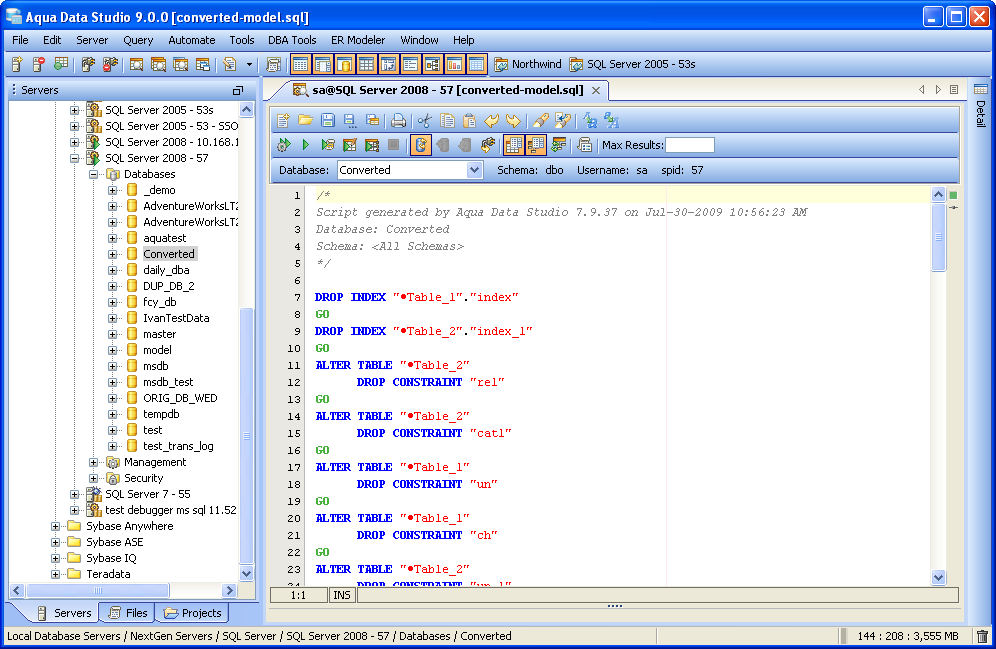 ER Models within Aqua Data Studio can be converted from any database version and type to any other database version and type. If there is a DB2 iSeries database that needs to be converted to a Microsoft SQL Server 2008 database, the Tools->Convert menu within the ER Modeler can be launched to begin the conversion process. It is possible to reverse engineer a database from DB2 iSeries into an ER Model, convert the ER Model to Microsoft SQL Server 2008 and then generate the DDL for Microsoft SQL Server 2008 to create a new database structure. Through the Tools->Convert menu, the ER Model Conversion tool allows migration from one database type to another. Migrating from a model from one database type to another involves three steps. 1. Select the ER Model and convert it to the proper database target: Open an ER Model. Select Tools->Convert Model. Select the Database Type and Database Version to convert to, and press "OK". 2. Generate the DDL (Forward Engineering) needed for creating the database from the ER Model: The recently converted model opens immediately in a new ER Modeler window. Select Tools->Generate Script from the menu bar. Select the desired objects and objects types. Select the scripts options and destination for the file (or view it in the preview tab). 3. Run the Generated DDL script on the destination server within the Query Analyzer: Once the DDL script is completed, launch a query analyzer from the Main Application Menu Bar while using the appropriate connection. The target database must exist before the script is executed. A database can be created with commands in the Query Analyzer or through a right click in the Schema Browser on the appropriate server connection. For more on creating databases using Aqua Data Studio's GUI Tools in the Schema Browser, see "Creating Databases." Run the script in the Query Analyzer by dragging it into the window, or selecting "Open File" from the Query Analyzer Toolbar. Execute the script. The database structure will be created based on the generated script from the ER Model.