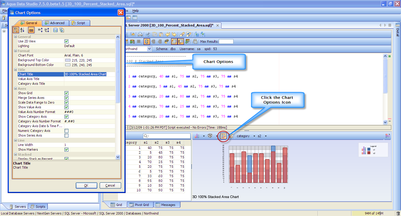 Aqua Data Studio has numerous chart types with in-depth functionality. You can enable support for charts, execute a query, generate a chart, script and share the charts with Business Analysts or Developers or any other Aqua Data Studio users. It is also possible to create AquaScripts that perform this functionality with far greater control and complexity. See the AquaScripts and AquaProjects section for more. Also see the Grid Chart and Pivot Grid information dealing with "Generate AquaScript" by right clicking on a chart. Users can re-execute the script and generate the charts with the exact properties that you have set, thus reducing development time. To Generate Chart Scripts: