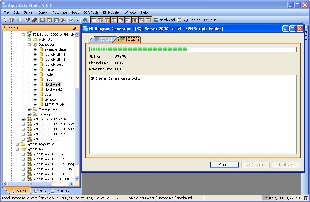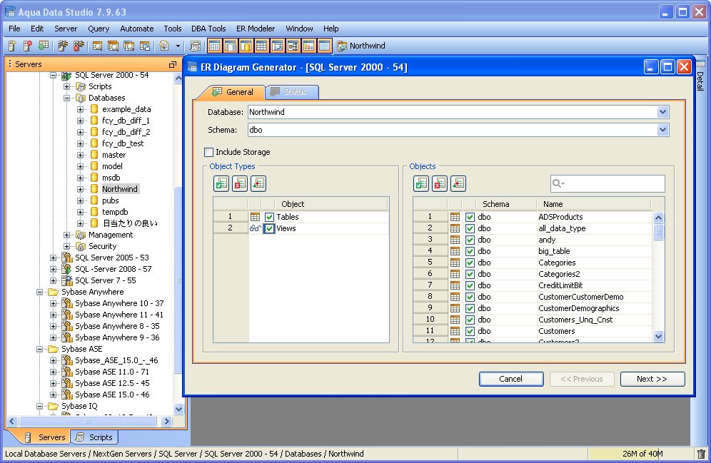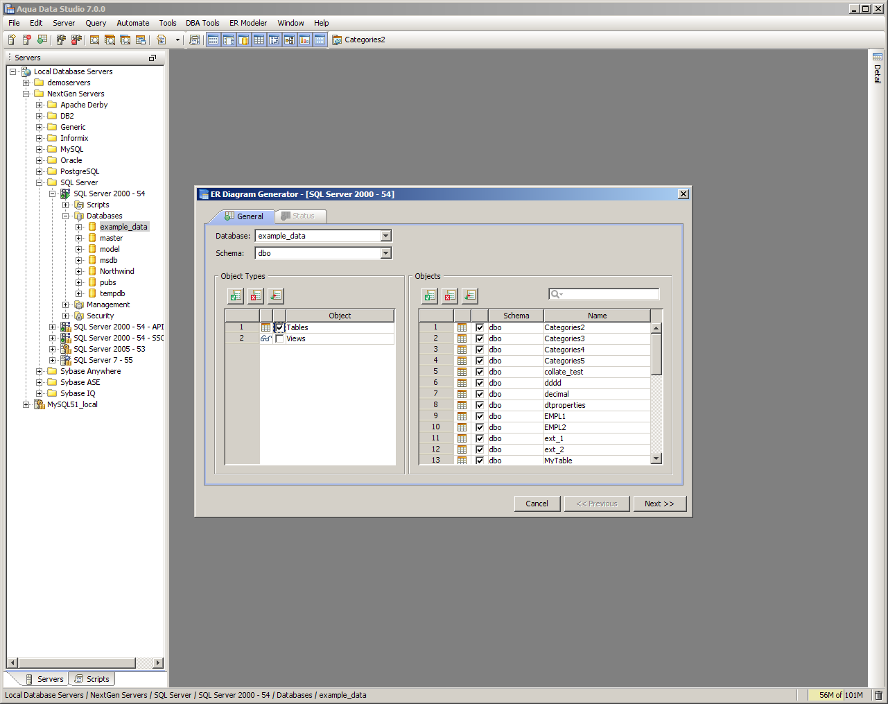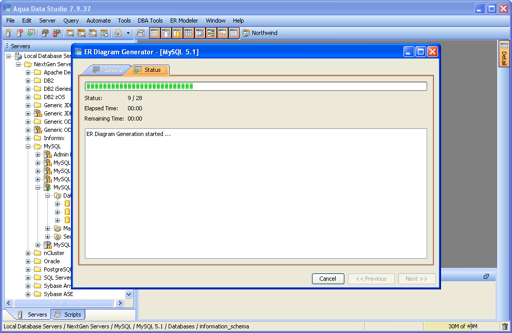 The Entity Relationship (ER) Diagram Generator helps users achieve a better understanding of their database schema by displaying the structure in a graphical format. The ER Diagram Generator uses the fully-featured Entity Relationship (ER) Modeler to create saveable, editable and exportable .xed diagrams that can be shared as part of a version control repository. See the full documentation on the Entity Relationship Modeler here for more on how to forward and reverse engineer database, migrate database and export for ERWin and Visio. Below are instructions on how to launch the ER Diagram Generator from the Main Appliction Menubar and the Schema Browser. 1. Launch the ER Diagram Generator dialog by Selecting ER Modeler->Generate from the Menu Bar or Selecting Tools->ER Diagram Generator from the right-click pop-up menu on a database object in the Schema Browser. 2. In the ER Diagram Generator dialog select a Database and Schema (or All Schemas). In the left panel, select one or more of the Object Types to be diagramed (Tables, Views or Both). Click the green check button to select all and the red X button to deselect all. All objects matching the selected schema and object types will appear in the right panel. Select one or more objects to be diagramed 3. Click Next to generate the diagram. The Status Tab will display with information on the diagram's creation including elapsed time, time remaining and number of objects diagrammed. Once the diagram is generated, the ER Modeler will open and display the new diagram. All of the table entity objects created can be edited, repositioned and exported. See the ER Modeler section for the full details on its capabilities and features. |
