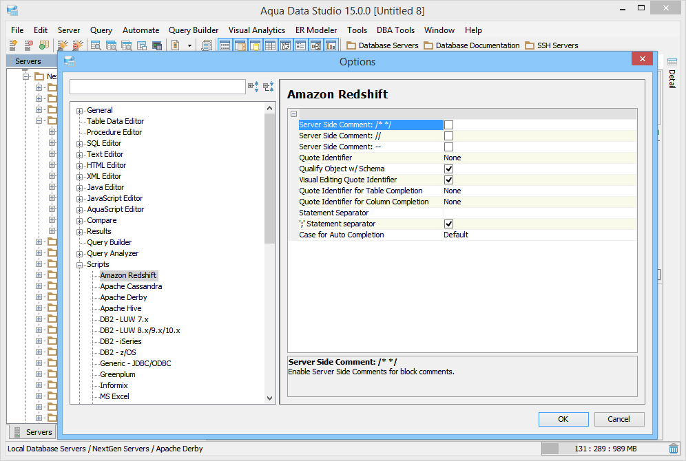ADS comments are configurable ... since different databases support different types of comments. In the options dialog box, a user may select each type of comment to be a client or server side comment per database. You may view what statement and comments will be executed on the server with an "Execute Parse" on a statement/script before executing. Below is a list of databases, what comment types they support and the default value for each database. Comments Options for each database vendor are available within File->Options->Scripts