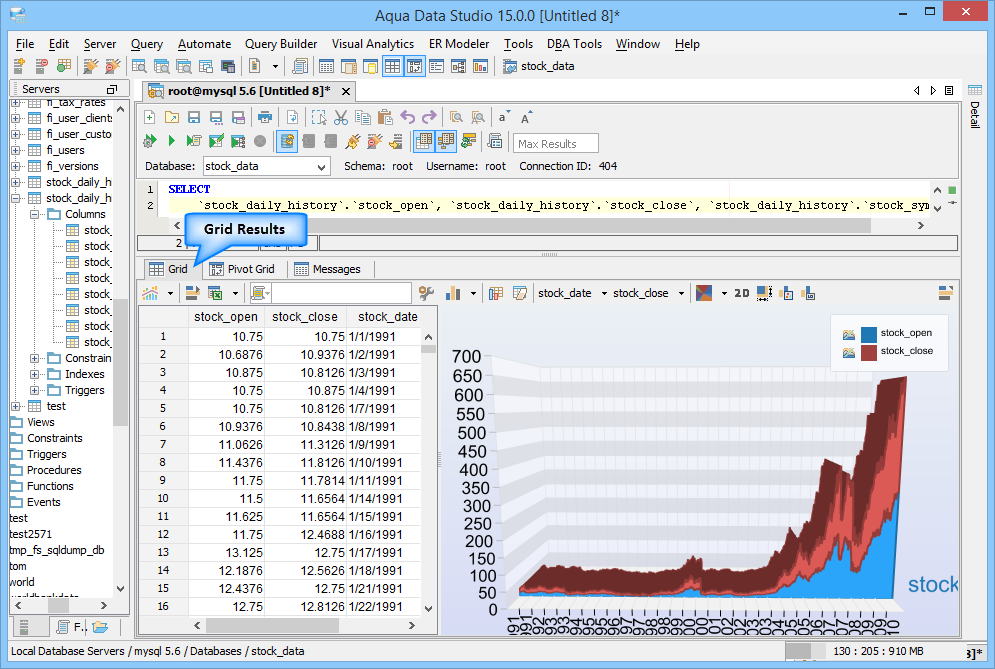 The Charting tools in Aqua Data Studio are for Business Analysts and Developers who want to analyse trends in stocks or get a dynamic view of data. The features include support for Candlestick, High Low Close, Bubble, Scatter, Surface, Stacked, Area, Pie, Bar, Column, Line and Map Charts. The Function Series introduced in Aqua Data Studio are a special series that makes use of other data series for their data values. You can select any of the function series to be combined with the standard chart types already available in ADS. It also includes support for 2D and 3D coordinate systems. Advanced options to Merge Series and Scripting charts for reuse are also available. Features of Charting Tools
