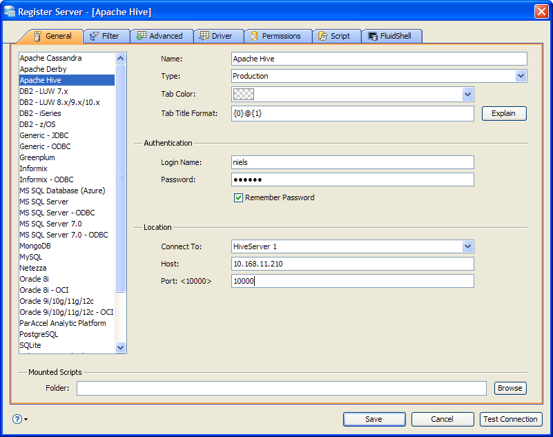 If you need to connect to Mapr, Hortonworks or Cloudera distributions of Hive, you must remove the Apache Hive JDBC Drivers that come preinstalled in <ADS_INSTALL>/lib/drivers. Replace them with drivers from your distribution before you choose a new distribution type in the Distribution dropdown within the General Tab. Follow the steps to connect to Hortonworks, Cloudera or Mapr Distributions of Hive on the Apache Hive JDBC Drivers page.