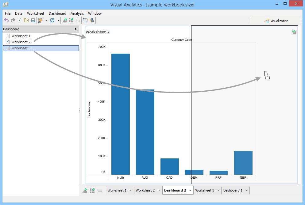 Once the Dashboard is created you can drag in any number of your Worksheets from the Worksheet pane listing them on the left side. If there aren't any sheets already present in a Dashboard, what you drag and drop will fill the whole area. Each additional worksheet you drag in will automatically take up half of the worksheet area it is dragged over; either vertically or horizontally depending on which edge your cursor is closest to. If you drag over the left edge of an area, when you drop you will fill in the left half. If you drag over the right edge of an area, you will fill in the right half when you drop. An outline will let you know where the worksheet will be displayed.