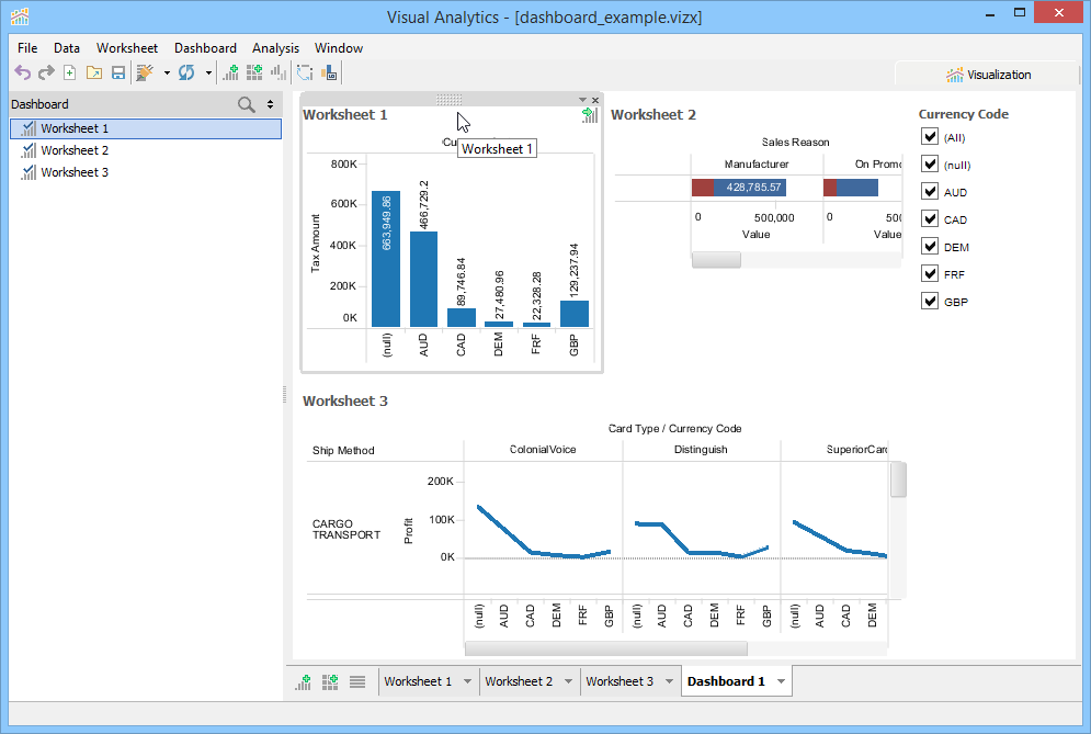 If any editing takes place in a worksheet, its changes are immediately reflected in whatever Dashboards contain it. Once multiple Worksheets have been placed in a Dashboard you can grab the handle at the top of each Worksheet's title bar and drag to rearrange them.