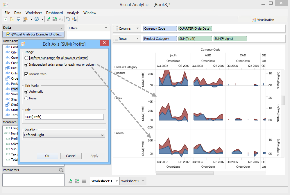 If you choose [Location] (None) and are unable to right click to generate the Edit Axis menu in the chart, you can right click on a measure in the Rows or Columns deck and use [Show Axis] to select a new display location for your hidden axes.