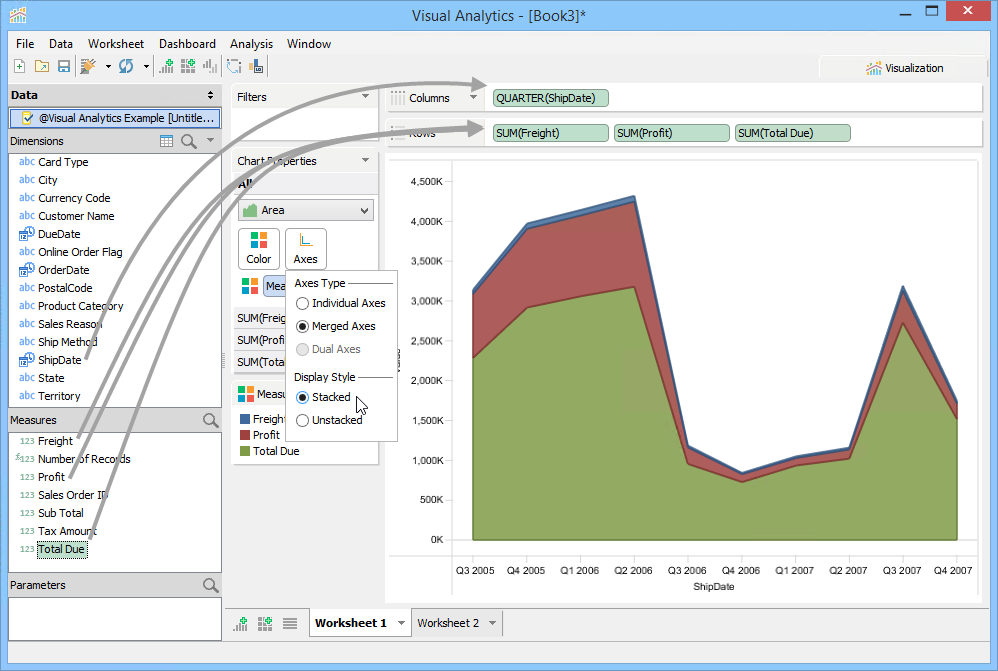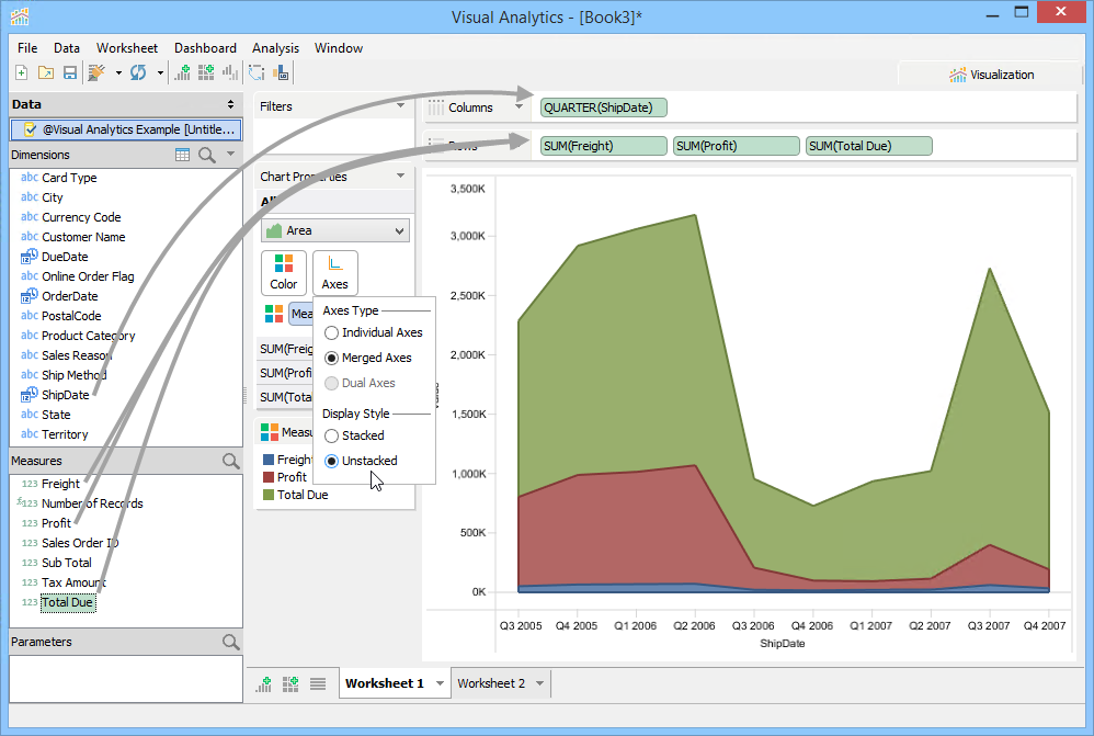 3. Drag Total Due, Freight and Profit from Measures to the Rows deck.