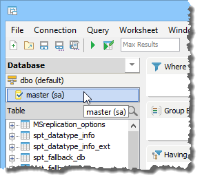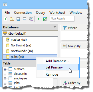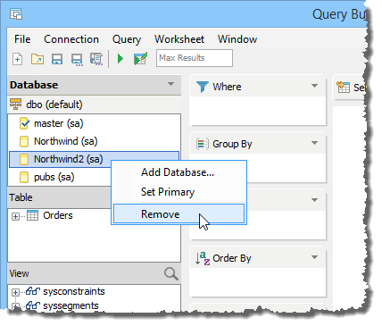 The databases will appear in the Database Pane of the Data Pane. If you do not choose a database when launching the Query Builder, whatever database is the default database for your registered server appears as [Primary] by default, which is indicated with a check mark. If you launch the Query Builder by right clicking directly on a database, that database will appear as Primary.