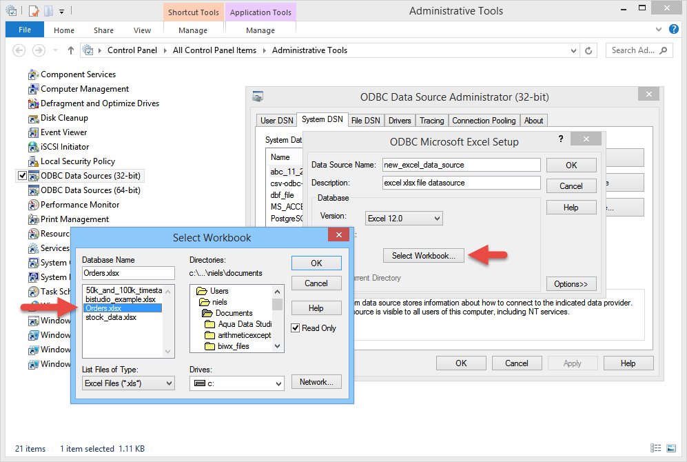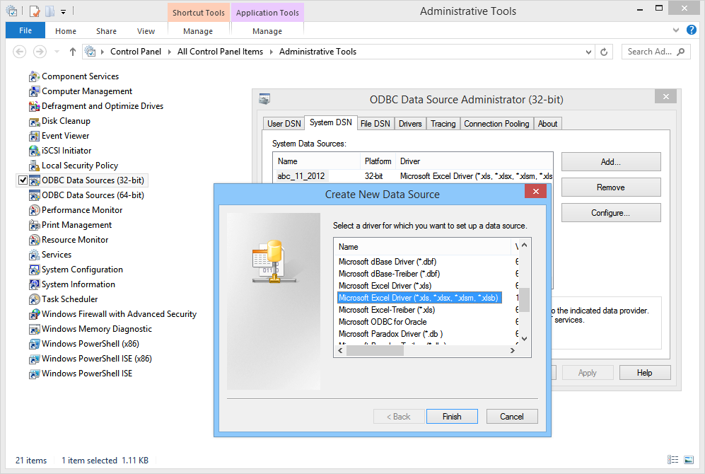 Your Installation of Aqua Data Studio bit version ( 32bit or 64bit ) must match your ODBC Driver for Excel. Only 32bit ODBC drivers work with the 32bit version of Aqua Data Studio. Only 64bit ODBC drivers work with the 64bit version of Aqua Data Studio. Mismatching the driver type with the version of Aqua Data Studio will prevent Aqua Data Studio from successfully connecting to your ODBC datasource.
