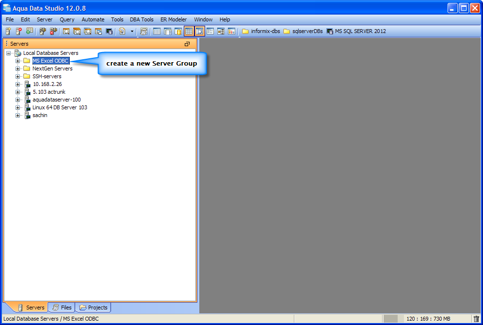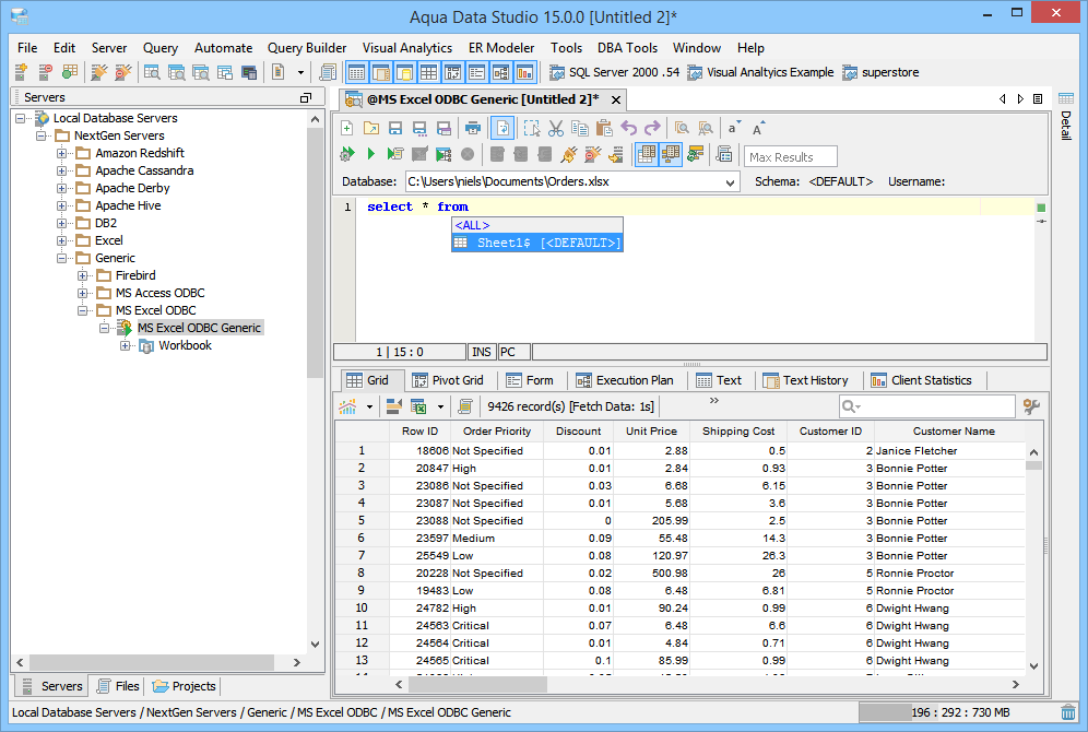 The Microsoft Excel ODBC Data Source is registered successfully in Aqua Data Studio. You can now connect to the newly registered Server and perform Data Manipulations.