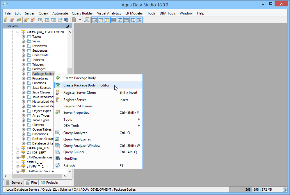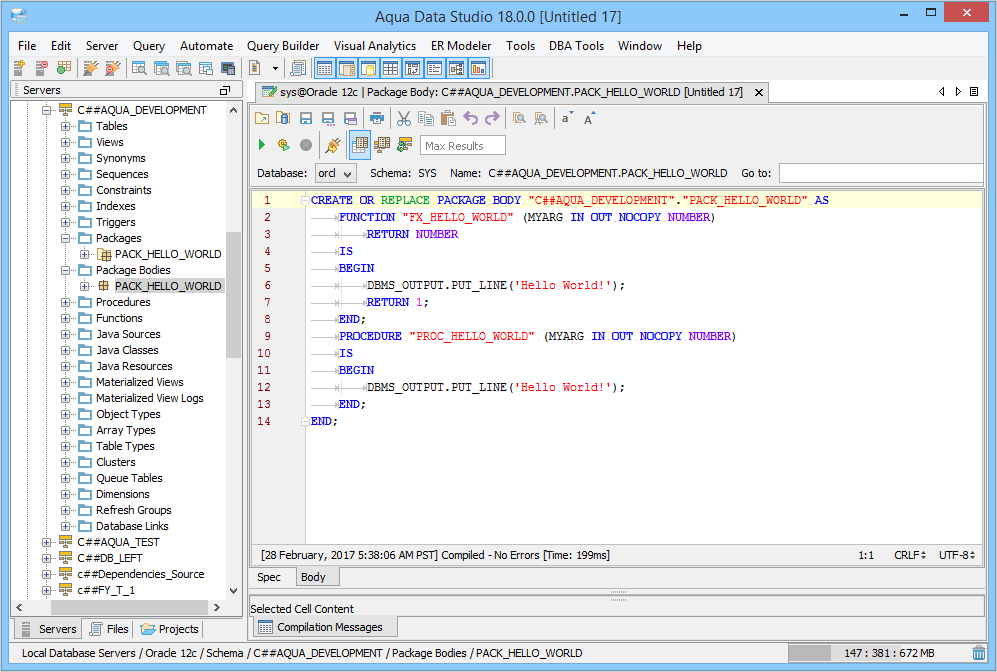 Aqua Data Studio can access and edit Procedures, Functions and Packages through the Schema Browser. Stored Procedures are subroutines stored in a database's dictionary and are often used for data validation and access control. They collect logic usually spread across several statements in complex actions for access from a single call. Functions are blocks of code to perform a series of actions used to extend the functionality of a database server. User defined functions are defined with CREATE FUNCTION in SQL statements. They can be used for converting and evaluating data or performing other actions. Packages, in Oracle, are used for encapsulating a group of functions, procedures and other program objects. Packages have specifications (definitions) and bodies. They provide containers for related items. Depending on the database version and vendor, Package, Procedure and Function debugging is also available. See the SQL Debuggers section for more. When Procedures, Functions and Packages are invalid, they are marked in the Schema Browser with a red box icon overlay. Expanding marked objects in the Schema Tree shows which specific Package contents are invalid. Options for determining if both the header and the body are both compiled when compile is executed can be set in File -> Options -> Procedure Editor.