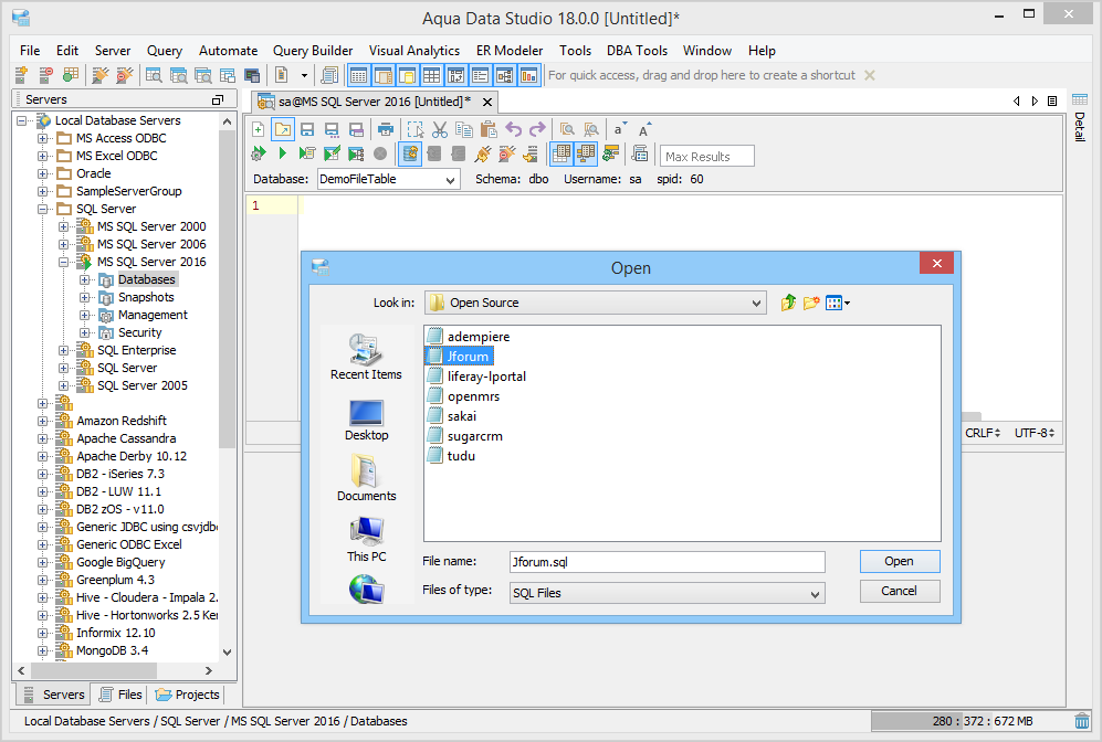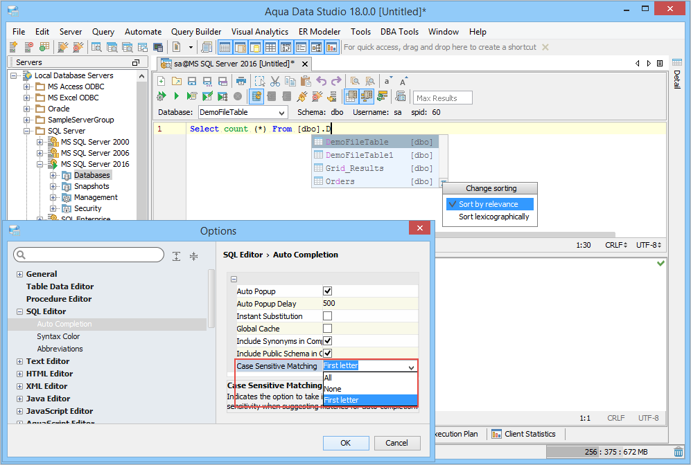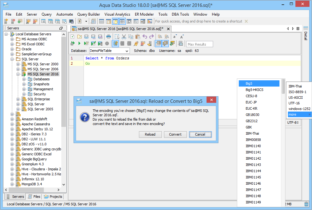 DO NOT separate your statements with a semicolon ";" - The reason Aqua Data Studio DOES NOT USE ";" AS A SEPARATOR FOR SQL STATEMENTS is because PL/SQL and T-SQL may contain ";". To keep the parser fast and simple for Auto-Completion and Describe we do not use it. If you try to use it as a separator Aqua Data Studio will not be able to identify your current statement and will give you the impression that Auto-Completion and other features do not work. Executing as a script will also generate errors from the RDBMS unable to understand your statement. Auto-Completion The Query Analyzer provides auto-completion popups for tables, views, synonyms and their columns. It determines when to popup tables or columns according to the cursor position in the SQL statement at the time of popup. Although the query window will intelligently decide when to popup options, you may activate the auto-completion feature with the CTRL-SPACE hot key. Abbreviation Support - User-defined abbreviations, created within the SQL Editor Options, function as customizable autocompletion strings. With a few keystrokes an entire block of SQL commands can be inserted. There are a selection of key combinations to trigger the expansion of an abbreviation. Abbreviations are set within File->Options->Editors->SQL Editor->Abbreviations. Encoding SQL Scripts & Query Results ADS supports SQL Scripts encoded in different encoding formats. When opening an SQL Script select the ’File Type’ with the appropriate encoding. ADS also supports the saving of resultsets into different encoding types. Unicode/Charactersets -ADS supports Unicode and International charactersets, but you must make sure you are using the international JRE and that ADS is using a font which supports the characterset you are using. The bundled JRE which comes with ADS is the International version, but if you are using your own you must make sure it supports International charactersets. The default font used by ADS does not support all charactersets, so if you need support for Japanese, Chinese and other languages you may need to change your font by selecting File-Options->General->Appearance and select an appropriate font. |
