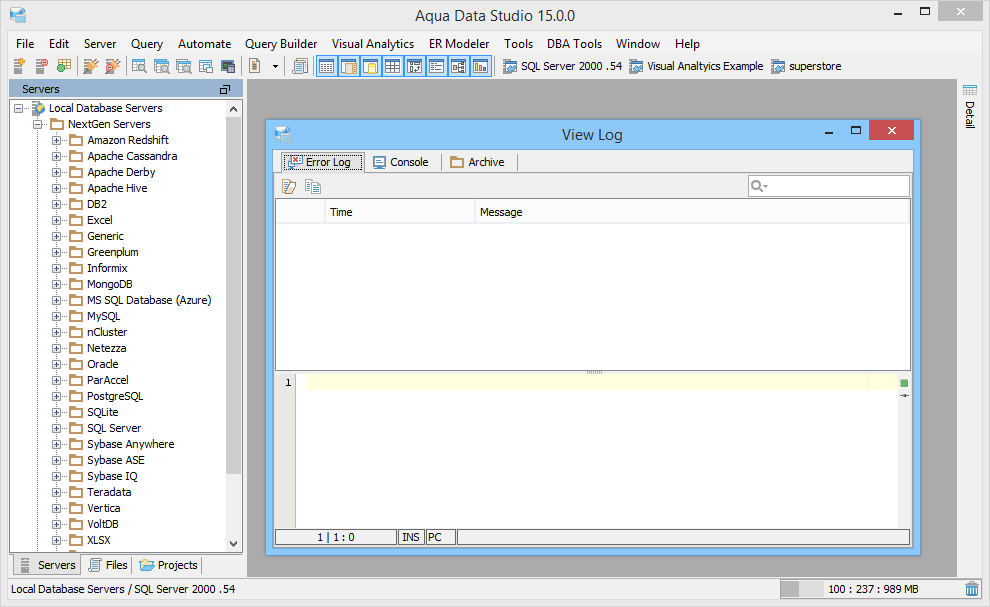 The View Log window provides three tabs for examining logs, errors and actions taken by Aqua Data Studio. This is useful for troubleshooting issues and support questions, and monitoring server connection status. The Logs and Support information can be found under the main application menu item Help
