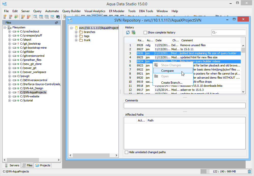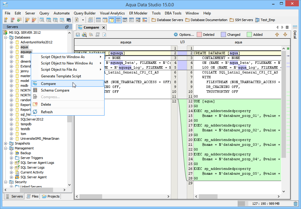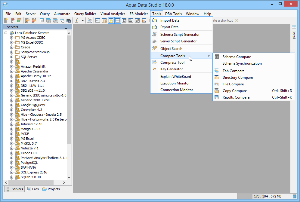Aqua Data Studio provides six compare tools to easily compare database schemas, schema objects, queries, query results, files, directories, clipboard contents and version control history.