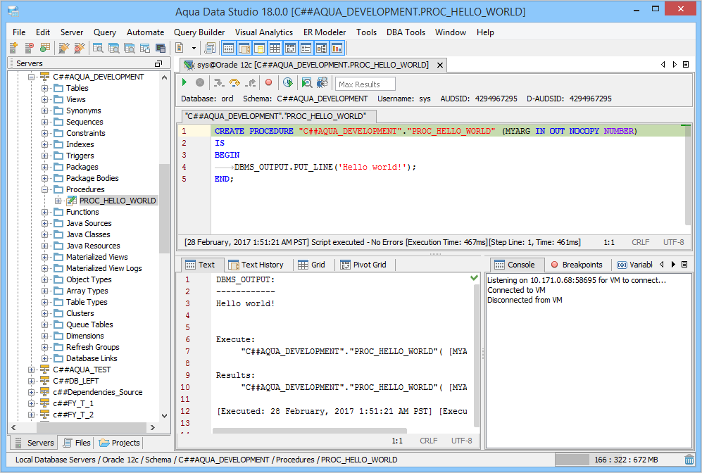 The Oracle SQL Debugger has been designed to help with testing and debugging of SQL functions and procedures for Oracle versions 9i and above. Launching the Oracle SQL Debugger The Oracle SQL Debugger is launched through a right click in the Schema Browser on Stored Procedures or User Defined Functions and selecting Debug from the popup menu. More than one debugger can be open at once, with each object to be debugged opened in a separate tab. Debugger Workspace The debugger displays a slightly modified version of the Query Analyzer Toolbar containing debugger specific menus and buttons. Along the top of the debugger are the Execute, Stop, Step Into, Step Over, Step Return, Toggle Breakpoint, Turn On Profiling, Target Query Window, Debugger Query Window buttons. Next to the buttons is the Display Max Results input field. Beneath the buttons is the connection information, username and SID information. The procedure or package displays in the debugging window, within which breakpoints can be added by right clicking and selecting "Toggle Breakpoint" from the popup menu. When this window has focus, and a line has been clicked, it is also possible to select "Run to Cursor," to run the debugger up to that line in the procedure. From the same popup menu, "Go to Current Line" brings the cursor to the current line, which is very useful when debugging multiple lengthy procedures. Below the debugger window are tabs for Console, Breakpoints, Variables, Watches, Stack Frames and Profile. The Console tab displays any errors or messages generated as debugging progresses. The Breakpoints tab indicates the lines of the procedure where breakpoints are set and allows them to stop execution or not. The Variables tab lists any variables by name, their value and type. The Watches tab allows selecting specific variables to be observed as they change, reducing from a possible list of hundreds to a select group. The Stack Frames tab lists the local variables of the functions, and the arguments to them. The Profile tab lists commonly used terms or values a user works with on a regular basis in the debugging process. Once execution of a procedure has begun through the use of the Start button at the top of the debugger window, the bottom left of the window is occupied by the Text, Text History, Grid, and Pivot Grid Results tabs. This area functions just as the Query Analyzer window does, revealing the results of procedures at each breakpoint or execution cursor. The Oracle SQL Debugger features include: