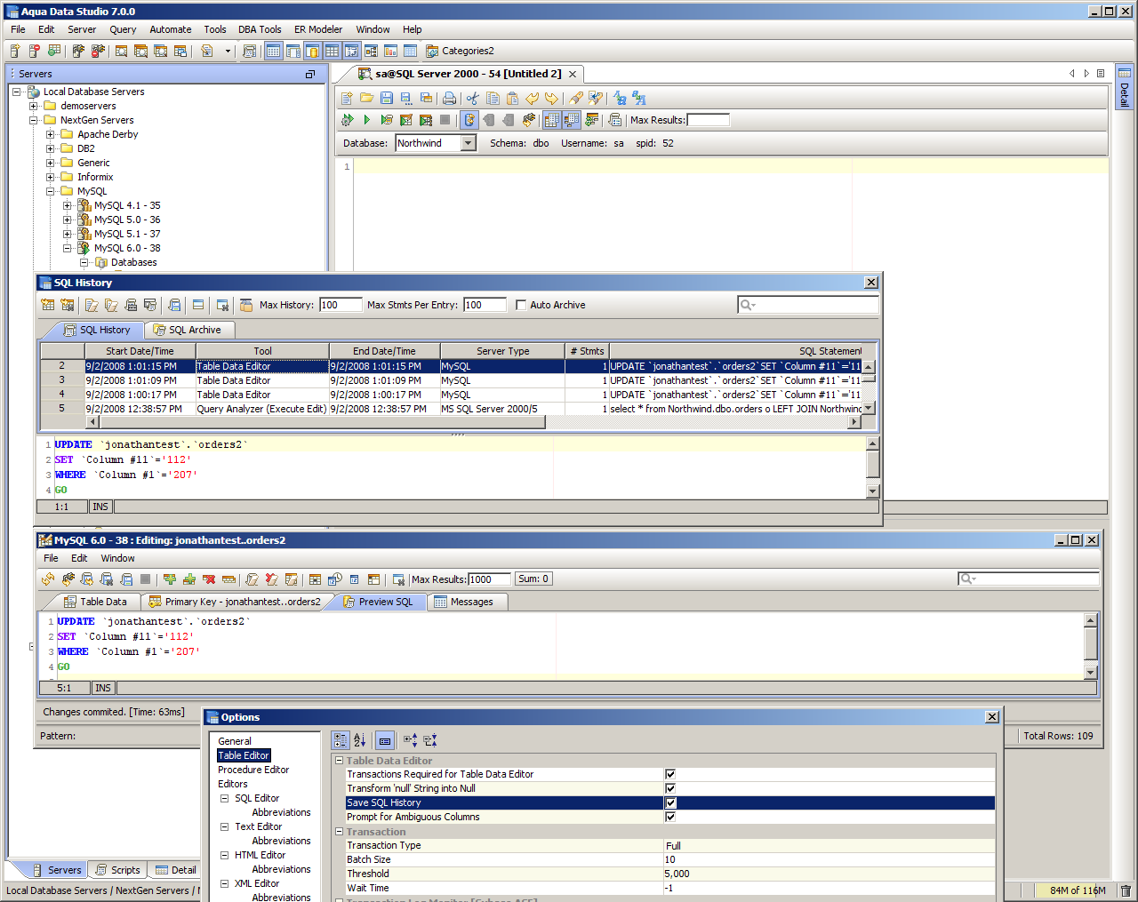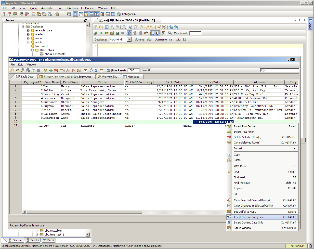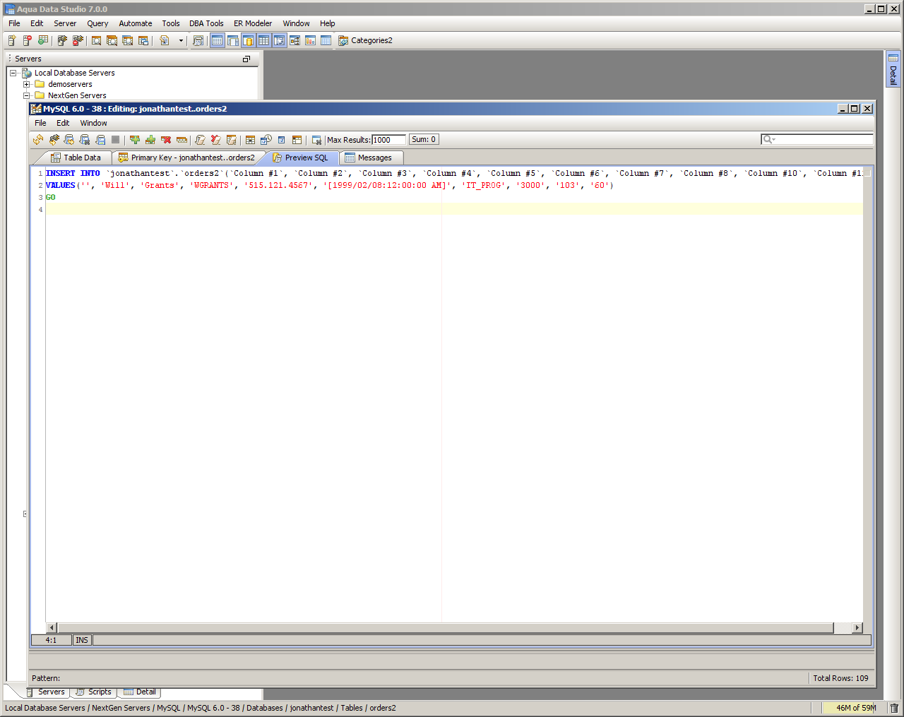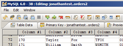 Aqua Data Studio provides a Table Data Editor which allows a user to graphically edit the resultset of an executed query on a table, including its data and rows. The editable result set is displayed in an Excel like grid. To activate a table editor you must either right click on a table in the Schema Browser and select "Edit Table Data (Top 1000)" or write a table SELECT statement and use the "Execute Edit" button. This will execute the query and return the resultset in a new Table Editor window. From this window a user may edit and save the contents of the resultset. The editor uses the primary key or any unique constraint to identify the row in the result which it will generate UPDATE statements for. If your resultset doesn’t have a primary key or unique constraint, you will be prompted to define a primary key in the primary key tab. A check mark indicates which column(s) participate in the primary key. There is an option within File->Options->Permissions to allow Primary Key Definition Changes. Table Data Editor Workspace Like the other tools of Aqua Data Studio, the Table Data Editor is part of the Application Docking Framework. The window for the Table Data Editor can remain open as other tools in Aqua Data Studio are used. The Table Data Editor's menus and icons are taken directly from the Main Application Toolbar. Their functionality for refreshing and reconnecting to database servers has been included to make it easier to reconnect and refresh table data without having to access the Main Application Menus and Toolbar. At the top are the File, Edit and Window menus. Below are Toolbar icons for Refresh, Reconnect, Save and Refresh, Save and Close, Save Script ("Save Script" stores the chosen directory path and uses it for subsequent save operations as a default directory for easier navigation), Stop, Add Row Above, Add Row Below, Clone Selected Row(s), Clear All Changes, Clear Selected Deleted Rows, Clear Changes in Selected Cells, Set Cells to Null, INSERT Current Date and Time, INSERT Current Date Only, Edit in Window, Close Window, Max Results, Aggregate Functions (when enabled) and Quick Filter. Below the Toolbar Icons are the tabs for Table Data, Primary Key, Preview SQL and Messages. The Window menu can be used to cycle through tabs when so many exist it is difficult know which one was focus via Window->Next Tab; Window->Previous Tab; Window->Focus Max Results. The layout of the data within the Table Data tab functions similar to a spreadsheet appliction, with the ability to insert rows and cells where desired via Find and Replace when needed. Most of the work done in the Table Data Editor occurs in the Table Data tab, which displays the data for the table(s) from the select statement used in the Execute Edit mentioned earlier. Row color and bolding assist in displaying recent changes and nulls in the data, and appear in the Table Data Editor modification logs (when enabled in File->Options->Table Editor->Modification Logs). A box appears around the content inside of a selected cell to identify content length where blank spaces may appear before text, but not be visible. Table Columns, must be added or removed from tables via context menus with right clicks in the Schema Browser or through the Query Analyzer by way of database commands. Using Edit->Format: AutoFit Column Width, cells can be highlighted and resized automatically using the menu, a key shortcut, or a double-click on the right border of the column header. This option can be configured from the dropdown menu. The Primary Key tab displays a list of all of the columns relating to the tables in the query used to launch the Table Data Editor via the Execute Edit command from the Query Analyzer. If more than one table was used in the query, a dialog appears to choose the primary keys and an additional Primary Key tab will display for each table with schema information in the tab title. The Preview SQL tab displays the DDL used to perform the edits made within the Table Data Editor with appropriate Syntax highlighting. The Messages tab displays any warnings or messages during table data modification. At the bottom of the Table Data Editor window are the Preview Panel (when enabled) and Status Bar. The Preview Panel creates a cell's preview in a split panel to allow the user to preview the currently selected value in the grid. This helps the display the full value of a narrow cell, including long string values or CLOB values. The Status Bar contains Pattern information to show the data type and range of selected cells at the bottom left, and Total Rows of the table at bottom right. After the changes are saved and the table is refreshed (Save and Refresh), the cursor selects the first cell of the selected row before save. When closing a modified window the application will prompt for "Save," "Discard" and "Cancel." Visual Editing The Table Data Editor allows you to add, edit and delete rows and changes in the editor are color coded so that you may see your changes before commiting them. Inserted/Modified/Deleted rows have light blue cell background. Modified cells have a slightly darker color for the text so it allows the user to see spaces. Cells in Inserted Rows also have the background color of the text shaded to identify invisible characters.