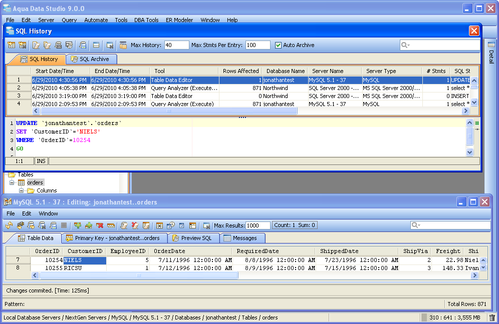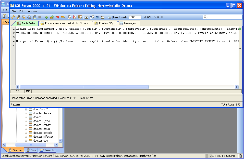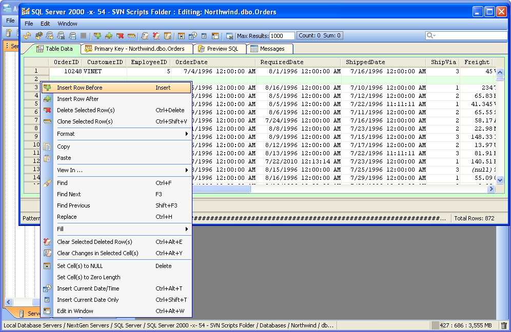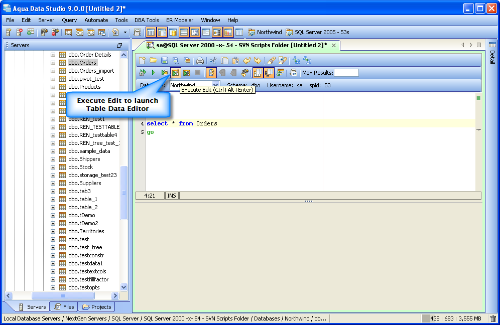 Aqua Data Studio provides a Table Data Editor which allows a user to graphically edit the resultset of an executed query on a table, including its data and rows. The editable result set is displayed in an Excel like grid. To activate a table editor you must either right click on a table in the Schema Browser and select "Edit Table Data (Top 1000)" or write a table SELECT statement and use the "Execute Edit" button. This will execute the query and return the resultset in a new Table Editor window. From this window a user may edit and save the contents of the resultset. The editor uses the primary key or any unique constraint to identify the row in the result which it will generate UPDATE statements for. If your resultset doesn’t have a primary key or unique constraint, you will be prompted to define a primary key in the primary key tab. A check mark indicates which column(s) participate in the primary key. There is an option within File->Options->Permissions to allow Primary Key Definition Changes. Table Data Editor Workspace Like the other tools of Aqua Data Studio, the Table Data Editor is part of the Application Docking Framework. The window for the Table Data Editor can remain open as other tools in Aqua Data Studio are used. The Table Data Editor's menus and icons are taken directly from the Main Application Toolbar. Their functionality for refreshing and reconnecting to database servers has been included to make it easier to reconnect and refresh table data without having to access the Main Application Menus and Toolbar. At the top are the File, Edit and Window menus. Below are Toolbar icons for Refresh, Reconnect, Save and Refresh, Save and Close, Save Script ("Save Script" stores the chosen directory path and uses it for subsequent save operations as a default directory for easier navigation), Stop, Add Row Above, Add Row Below, Clone Selected Row(s), Clear All Changes, Clear Selected Deleted Rows, Clear Changes in Selected Cells, Set Cells to Null, INSERT Current Date and Time, INSERT Current Date Only, Edit in Window, Close Window, Max Results, Aggregate Functions (when enabled) and Quick Filter. Below the Toolbar Icons are the tabs for Table Data, Primary Key, Preview SQL and Messages. The Window menu can be used to cycle through tabs when so many exist it is difficult know which one was focus via Window->Next Tab; Window->Previous Tab; Window->Focus Max Results. The layout of the data within the Table Data tab functions similar to a spreadsheet appliction, with the ability to insert rows and cells where desired via Find and Replace when needed. Most of the work done in the Table Data Editor occurs in the Table Data tab, which displays the data for the table(s) from the select statement used in the Execute Edit mentioned earlier. Row color and bolding assist in displaying recent changes and nulls in the data, and appear in the Table Data Editor modification logs (when enabled in File->Options->Table Editor->Modification Logs). A box appears around the content inside of a selected cell to identify content length where blank spaces may appear before text, but not be visible. Table Columns, must be added or removed from tables via context menus with right clicks in the Schema Browser or through the Query Analyzer by way of database commands. Using Edit->Format: AutoFit Column Width, cells can be highlighted and resized automatically using the menu, a key shortcut, or a double-click on the right border of the column header. This option can be configured from the dropdown menu. The Primary Key tab displays a list of all of the columns relating to the tables in the query used to launch the Table Data Editor via the Execute Edit command from the Query Analyzer. If more than one table was used in the query, a dialog appears to choose the primary keys and an additional Primary Key tab will display for each table with schema information in the tab title. The Preview SQL tab displays the DDL used to perform the edits made within the Table Data Editor with appropriate Syntax highlighting. The Messages tab displays any warnings or messages during table data modification. At the bottom of the Table Data Editor window are the Preview Panel (when enabled) and Status Bar. The Preview Panel creates a cell's preview in a split panel to allow the user to preview the currently selected value in the grid. This helps the display the full value of a narrow cell, including long string values or CLOB values. The Status Bar contains Pattern information to show the data type and range of selected cells at the bottom left, and Total Rows of the table at bottom right. After the changes are saved and the table is refreshed (Save and Refresh), the cursor selects the first cell of the selected row before save. When closing a modified window the application will prompt for "Save," "Discard" and "Cancel." Visual Editing The Table Data Editor allows you to add, edit and delete rows and changes in the editor are color coded so that you may see your changes before commiting them. Inserted/Modified/Deleted rows have light blue cell background. Modified cells have a slightly darker color for the text so it allows the user to see spaces. Cells in Inserted Rows also have the background color of the text shaded to identify invisible characters.
