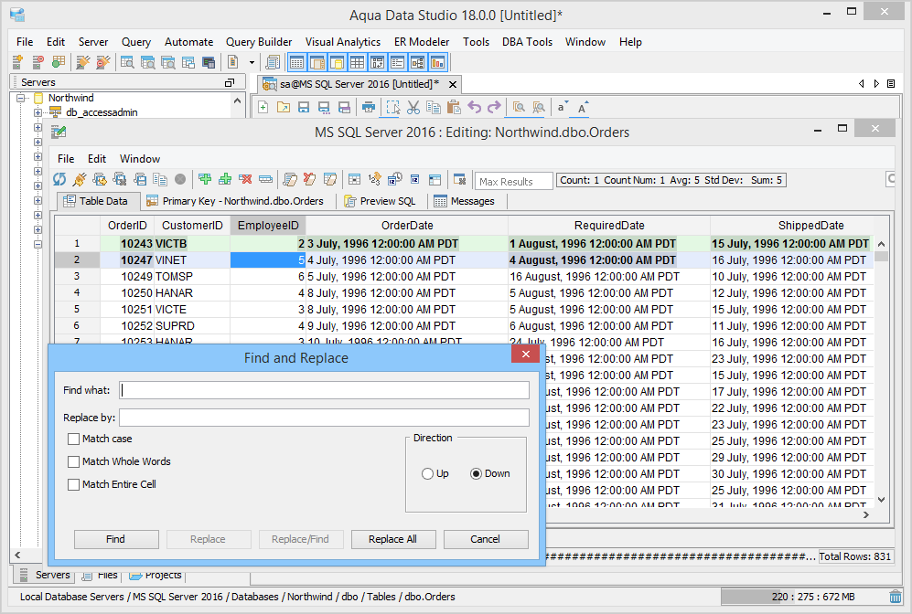 Find/Replace Options Find and Replace within the Table Data Editor functions similar to the Find and Replace of Aqua Data Studio's Editors. Regular Expressions cannot be used in the Find and Replace within the Table Data Editor.