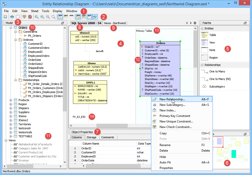 ER Modeler Workspace and Dockable Framework Overview There are five major functional areas within the ER Modeler Workspace where most of the creation and editing of models takes place: Model Node Browser, Sheet, Entity Palette, Object Properties Pane, and Overview. Model Node Browser: Presents all of the objects within a diagram in a tree containing all relationships, tables, views and notes. The tree can be expanded or collapsed to display more detailed information such as Indexes and Constraints. Sheet: Shows the diagram contents in independent views for manual or automatic layout. This is the drawing area of the ER Diagram. Objects can display on more than one sheet at a time. Entity Palette: Displays the entities which can be created. Left clicking on one converts the into a tool cursor for dragging out the entity in the sheet. Object Properties Pane: Displays, in non-editable form, the properties of the selected object or objects. Overview: A bird’s eye view of the current sheet, allowing fast navigation with a draggable and resizeable zoom rectangle. The rectangle indicates what portion of the diagram is currently being viewed. Workspace Diagram A more in-depth description of the ER Modeler's menus and panels follows. The numbered sections relate to the screenshot. Though not shown below, the Properties window, available for editing when an item is double-clicked or right clicked, is discussed on the pages on how to create tables, indexes, constraints, relationships, and add notes and regions. 1. Menu Bar: Contains all of the menus available in the ER Modeler. Its menus are context sensitive based on the current selection in the model. All available menus are listed below.