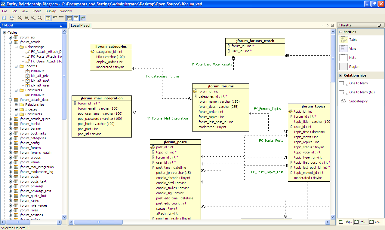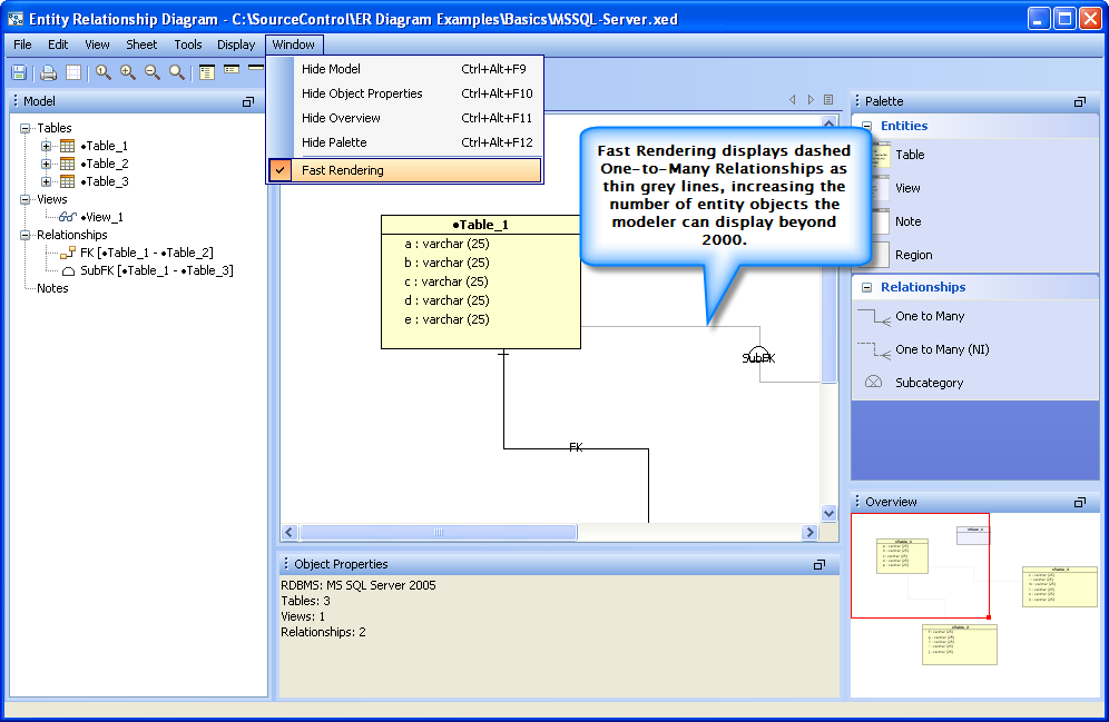 ER Modeler Workspace and Dockable Framework Overview There are five major functional areas within the ER Modeler Workspace where most of the creation and editing of models takes place: Model Node Browser, Sheet, Entity Palette, Object Properties Pane, and Overview. Model Node Browser: Presents all of the objects within a diagram in a tree containing all relationships, tables, views and notes. The tree can be expanded or collapsed to display more detailed information such as Indexes and Constraints. Sheet: Shows the diagram contents in independent views for manual or automatic layout. This is the drawing area of the ER Diagram. Objects can display on more than one sheet at a time. Entity Palette: Displays the entities which can be created. Left clicking on one converts the into a tool cursor for dragging out the entity in the sheet. Object Properties Pane: Displays, in non-editable form, the properties of the selected object or objects. Overview: A bird’s eye view of the current sheet, allowing fast navigation with a draggable and resizeable zoom rectangle. The rectangle indicates what portion of the diagram is currently being viewed. Workspace Diagram A more in-depth description of the ER Modeler's menus and panels follows. The numbered sections relate to the screenshot. Though not shown below, the Properties window, available for editing when an item is double-clicked or right clicked, is discussed on the pages on how to create tables, indexes, constraints, relationships, and add notes and regions. 1. Menu Bar: Contains all of the menus available in the ER Modeler. Its menus are context sensitive based on the current selection in the model. All available menus are listed below.