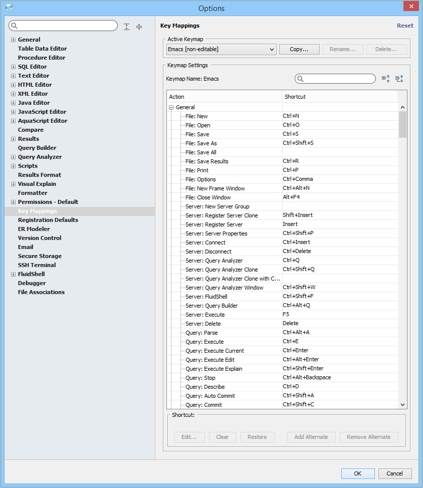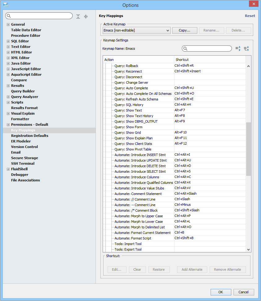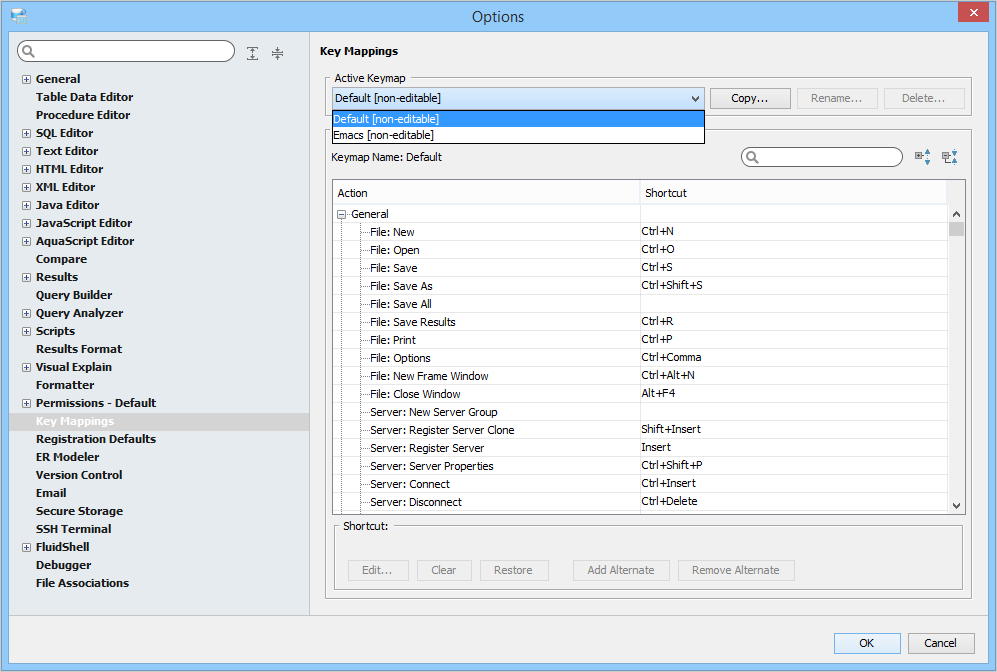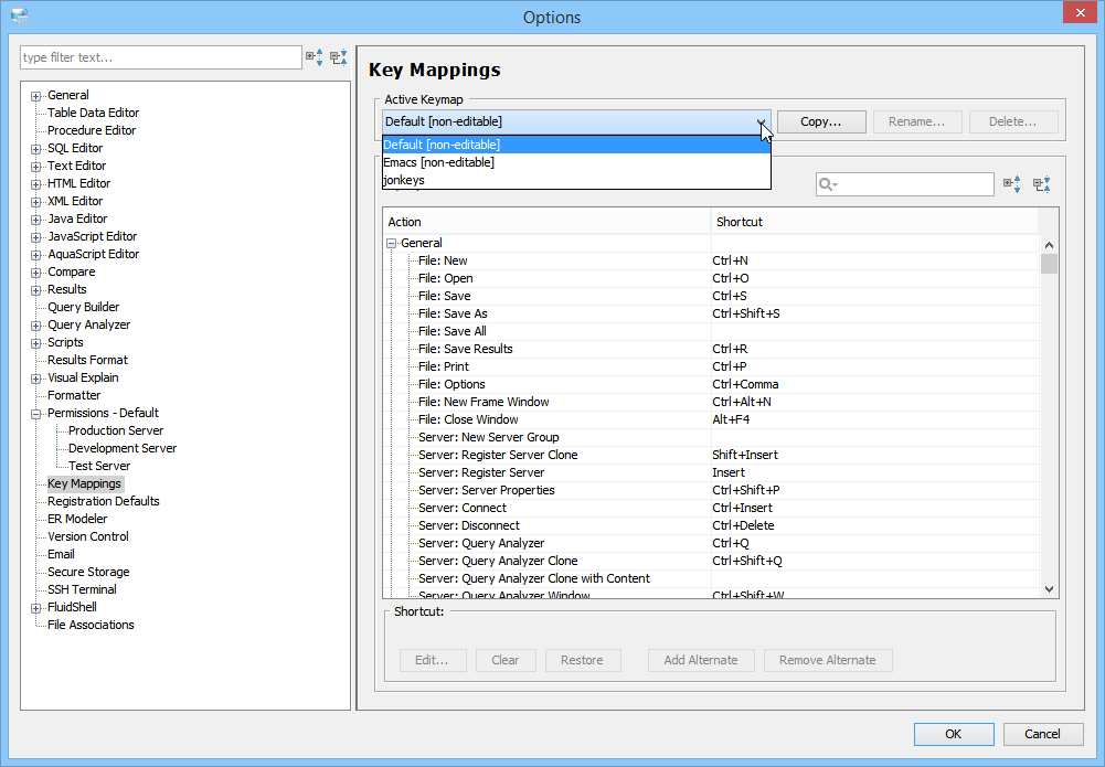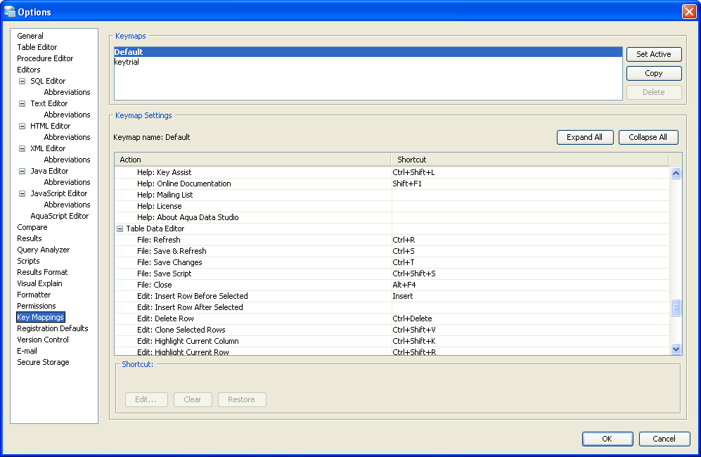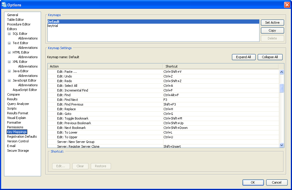 Key Mapping Options Key Mappings - The Key Mapping Options allows you to configure new key mapping profiles with new key bindings. This allows you to configure any keystroke to any action. The Key Mapping Options allow creating custom keymaps by copying existing keymaps, then configuring individual shortcut key bindings within a custom keymap. All custom keymaps may be edited, renamed and deleted. It is possible to add alternate keybinding shortcuts within a custom keymap for the same action. There are two built-in keymaps which cannot be renamed, edited or deleted, but may be copied as the foundation for new custom keymaps: