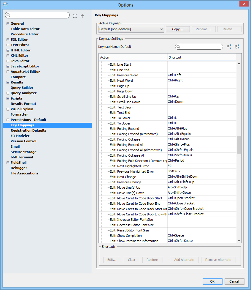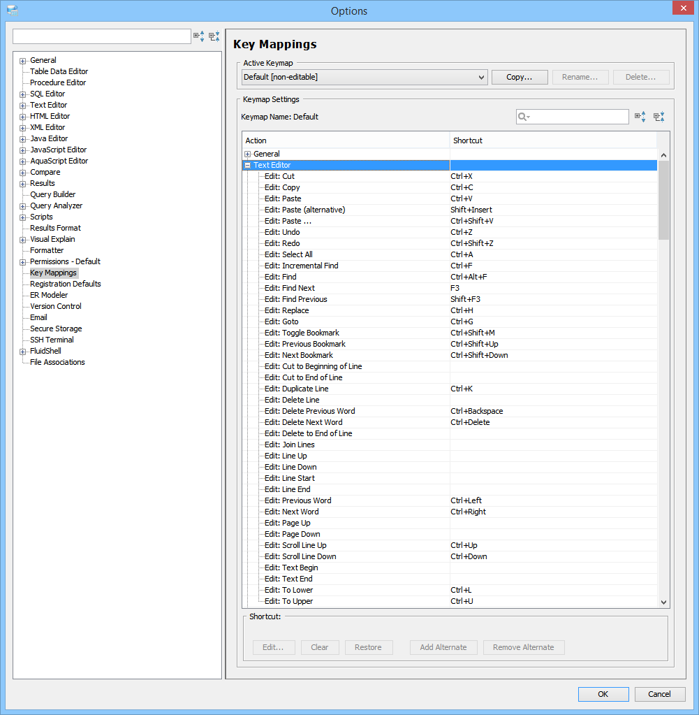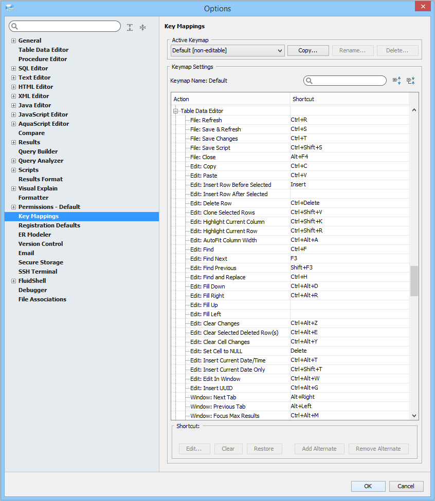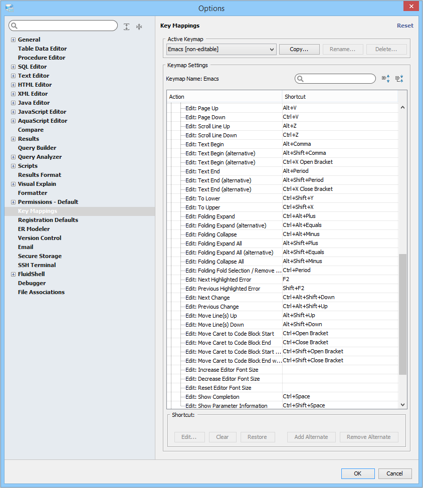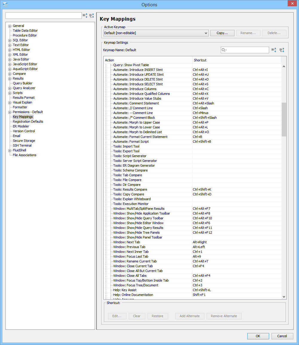 Key Mapping Options Key Mappings - The Key Mapping Options allows you to configure new key mapping profiles with new key bindings. This allows you to configure any keystroke to any action. The Key Mapping Options allow creating custom keymaps by copying existing keymaps, then configuring individual shortcut key bindings within a custom keymap. All custom keymaps may be edited, renamed and deleted. It is possible to add alternate keybinding shortcuts within a custom keymap for the same action. There are two built-in keymaps which cannot be renamed, edited or deleted, but may be copied as the foundation for new custom keymaps: