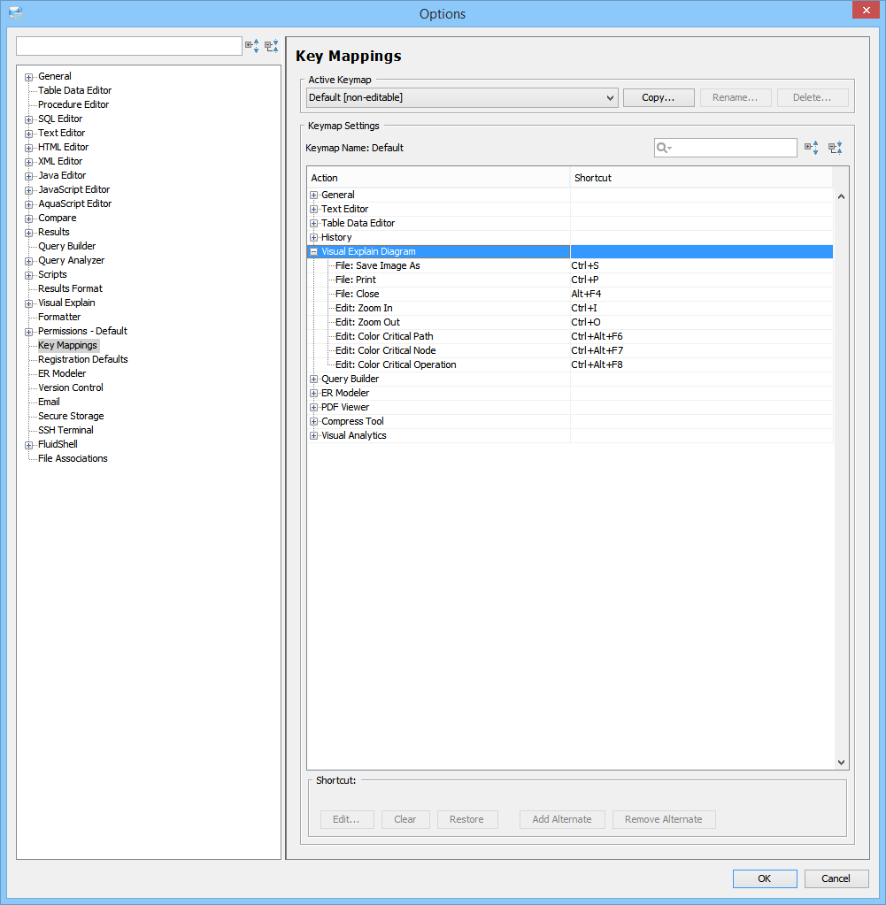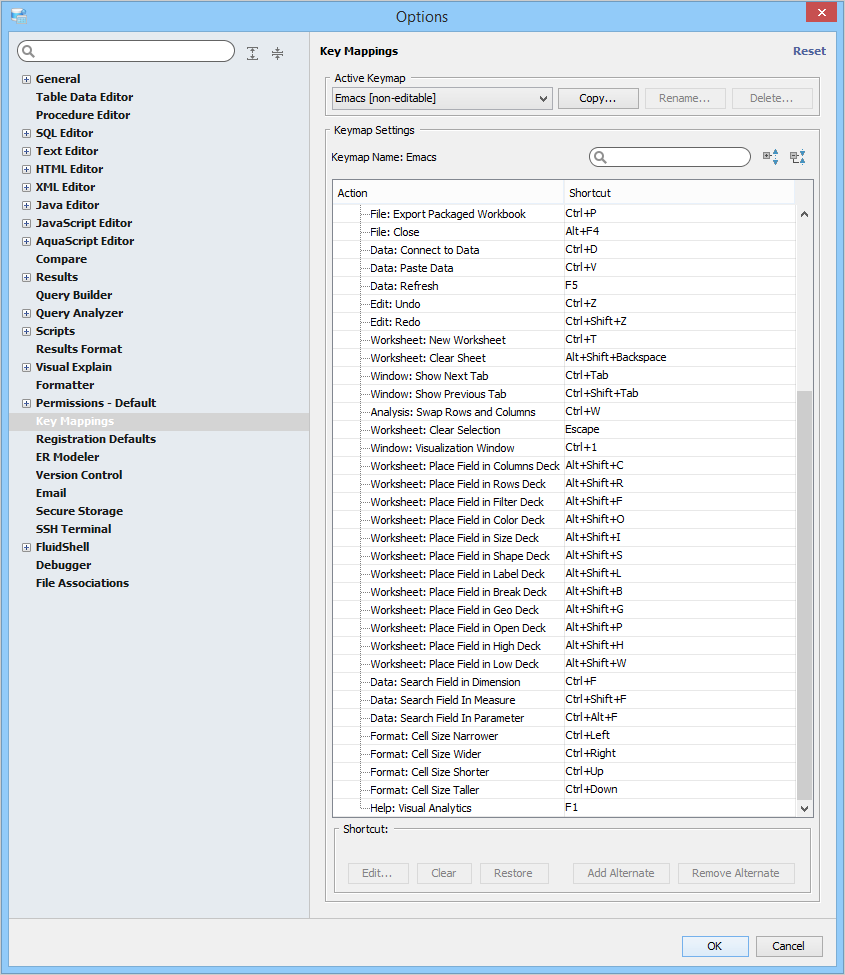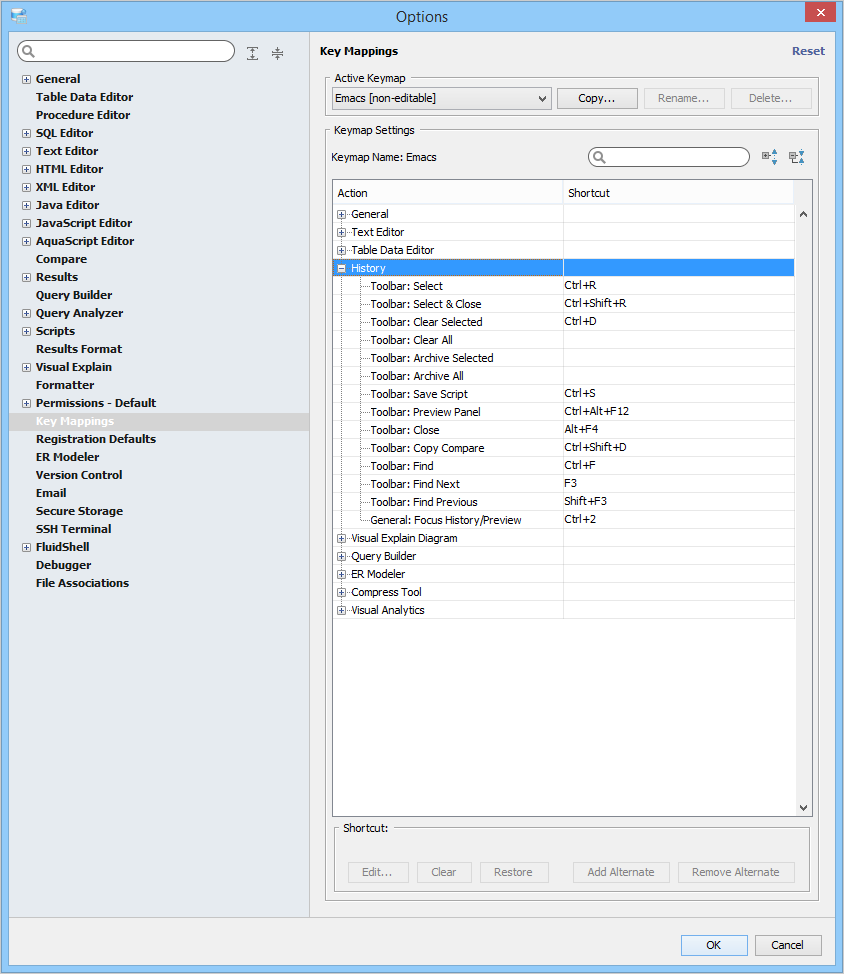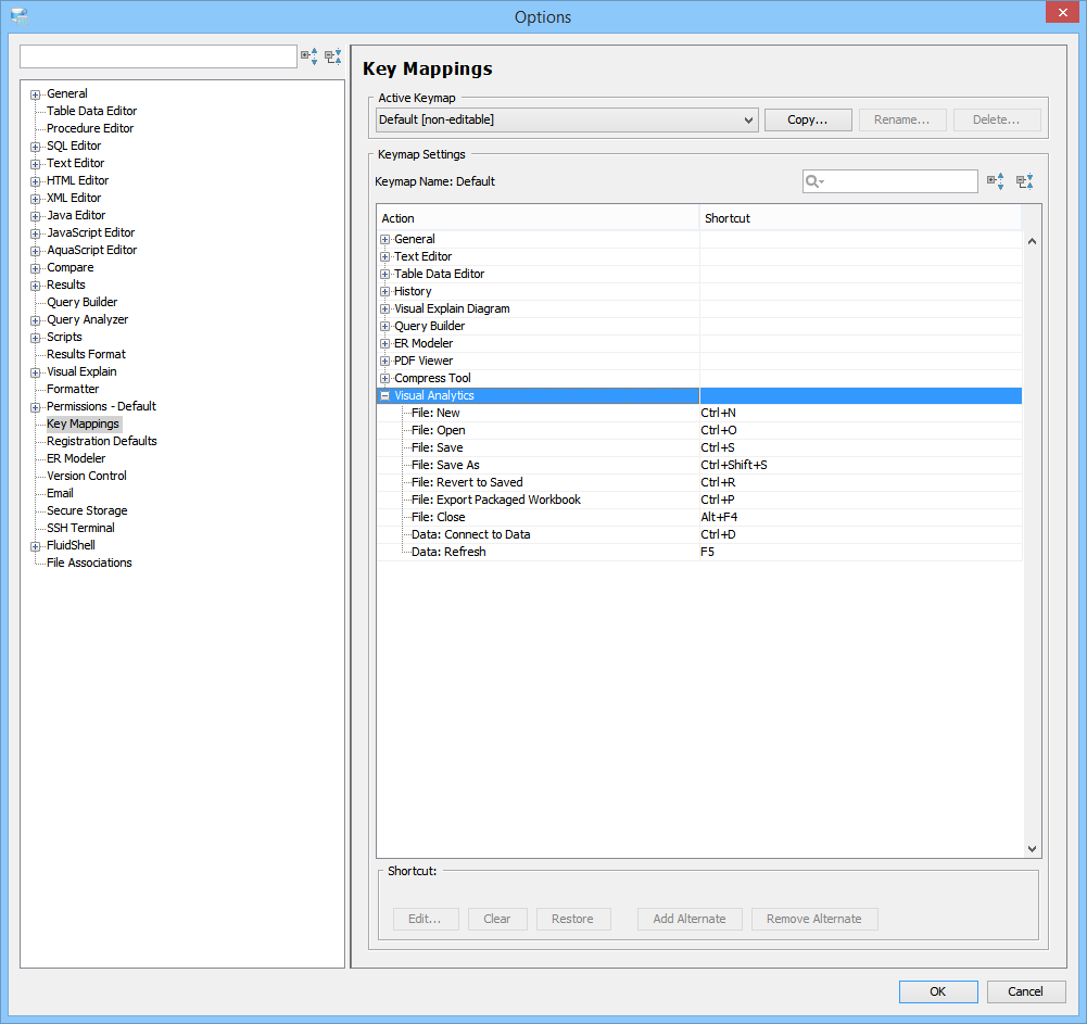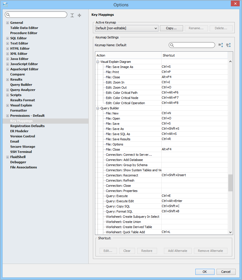 Key Mapping Options Key Mappings - The Key Mapping Options allows you to configure new key mapping profiles with new key bindings. This allows you to configure any keystroke to any action. The Key Mapping Options allow creating custom keymaps by copying existing keymaps, then configuring individual shortcut key bindings within a custom keymap. All custom keymaps may be edited, renamed and deleted. It is possible to add alternate keybinding shortcuts within a custom keymap for the same action. There are two built-in keymaps which cannot be renamed, edited or deleted, but may be copied as the foundation for new custom keymaps: