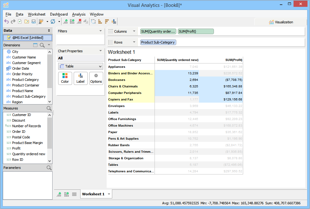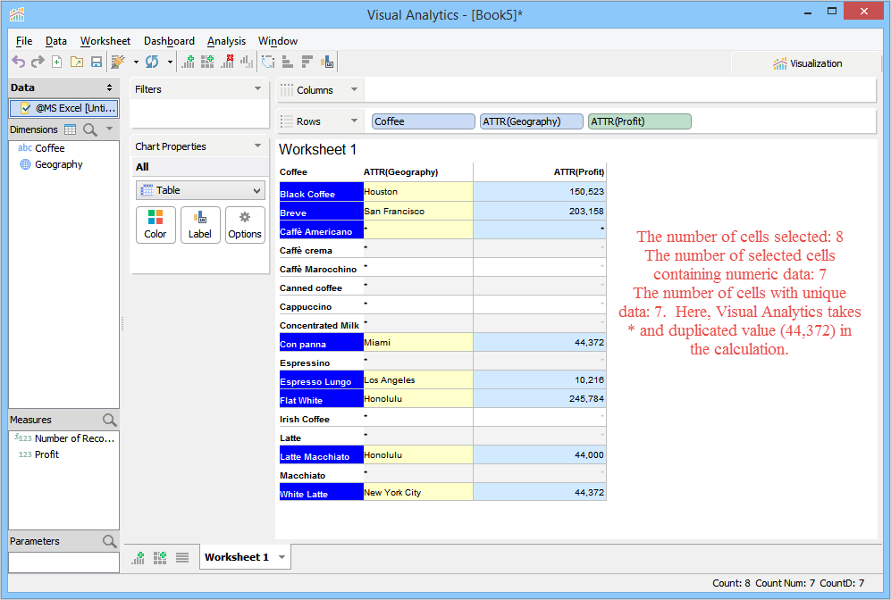 The status bar at the bottom of Visual Analytics window displays built-in aggregate functions when two or more segments are highlighted. By default, Visual Analytics only displays the sum of numerical values for the highlighted segments. To choose more functions, right-click on the status bar and then click the desired functions.