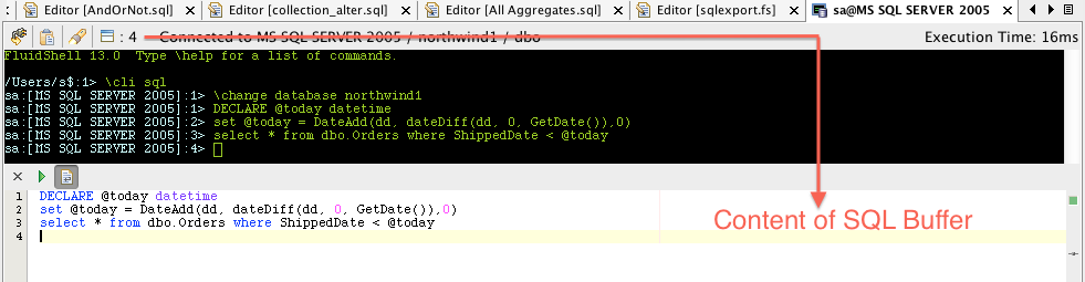 \cli sql \change database northwind1 DECLARE @today datetime set @today = DateAdd(dd, dateDiff(dd, 0, GetDate()),0) select * from dbo.Orders where ShippedDate < @today \sqlexport -f csv -o /Users/s/Desktop/output.csv