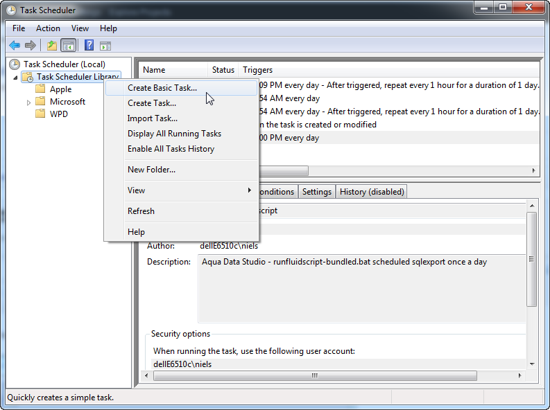 You can now use the OS scheduler to automate running of this csv file on a daily basis. To launch the Windows Task Scheduler choose Start > Control Panel > Administrative Tools > Task Scheduler. When it opens, expand the Task Scheduler Library in the pane on the left and right click to Create Task and give it a meaningful name and description.