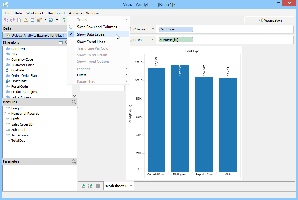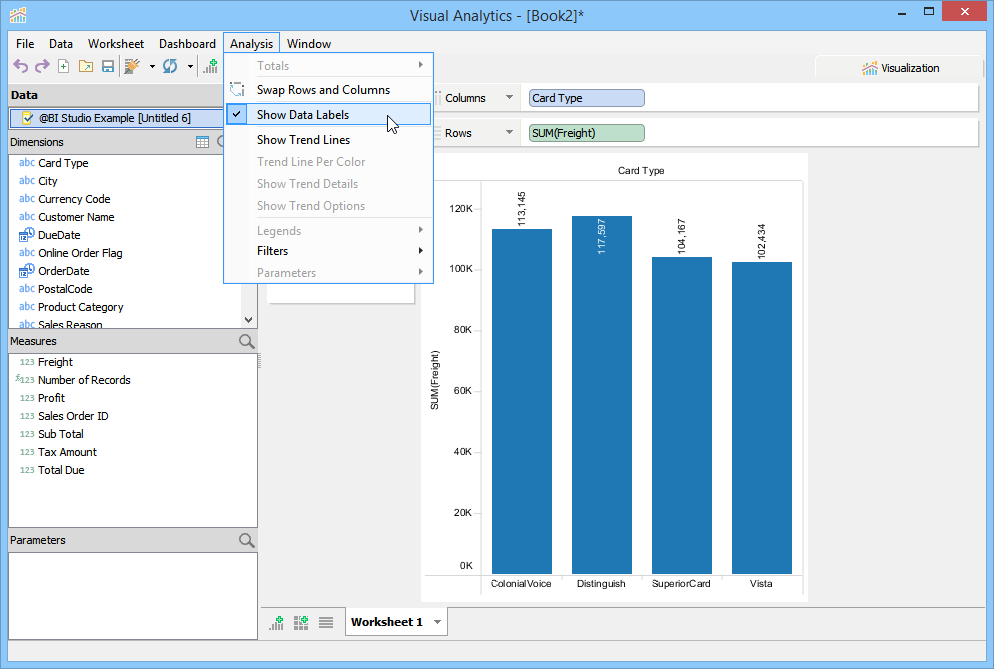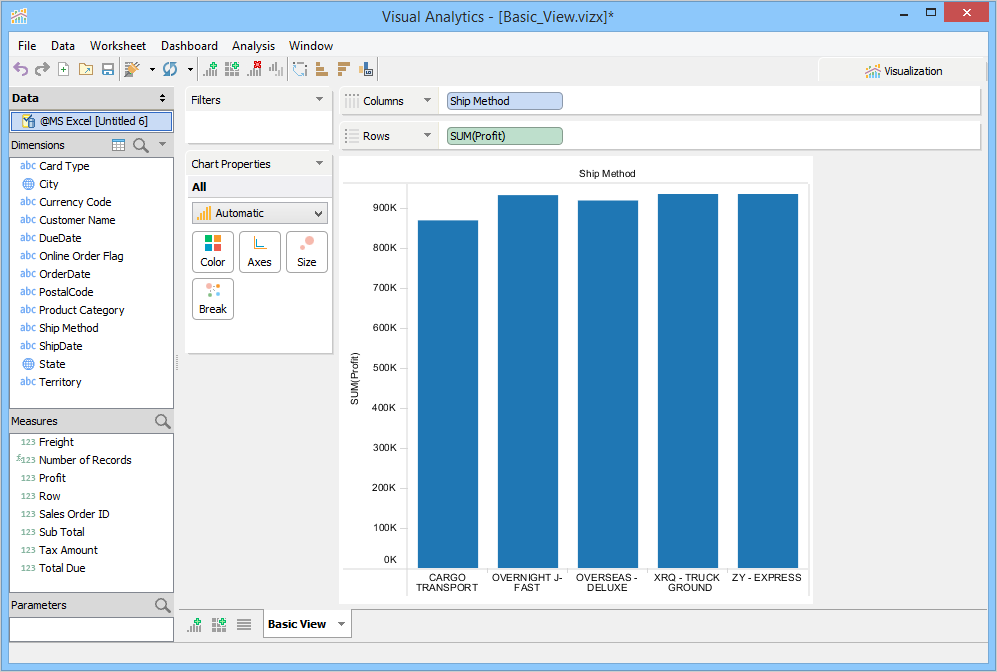 For this example, you will build a Basic View to display Profit by Credit Card Type based on the Visual Analytics Example xlsx file we connected to in the Building Views page. Perform the following steps to build the view.