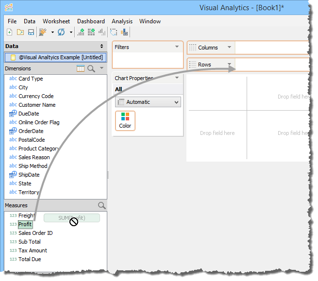 This basic process is used throughout Visual Analytics: Drag one or more items from the Data Pane into Decks and adjust properties and options to alter how the data appears in the view pane.