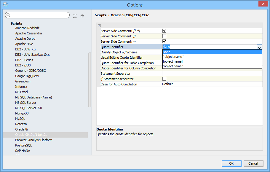 To choose a quote identifier, on the Aqua Data Studio menu bar > File > Options > Scripts > <Database_Name> > Quote Identifier.