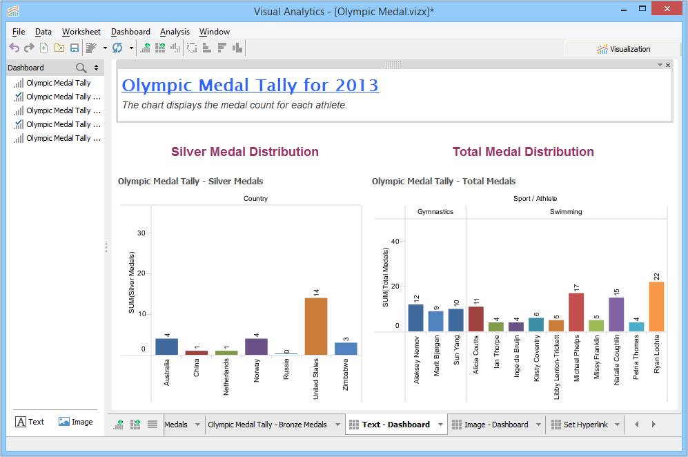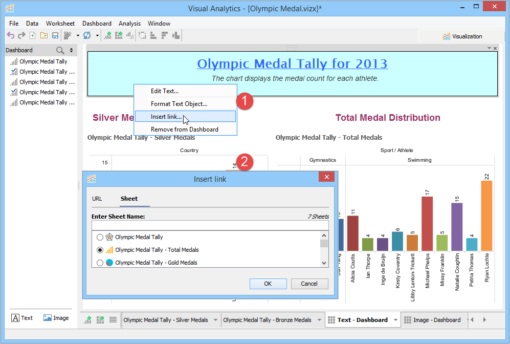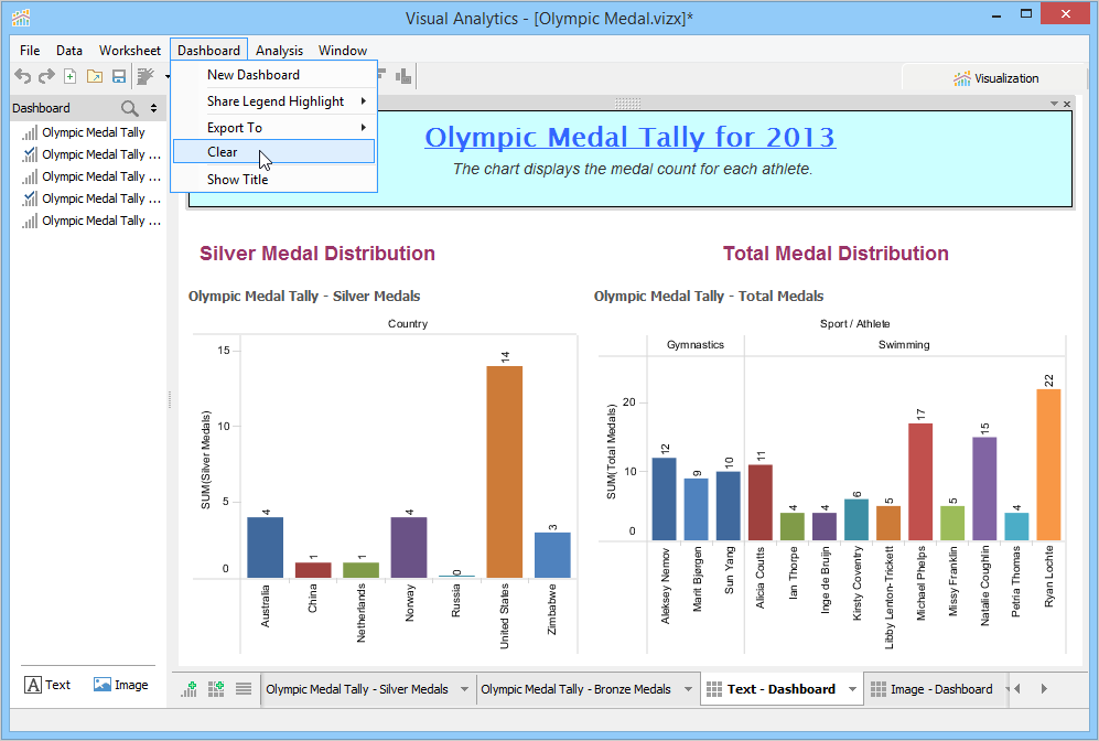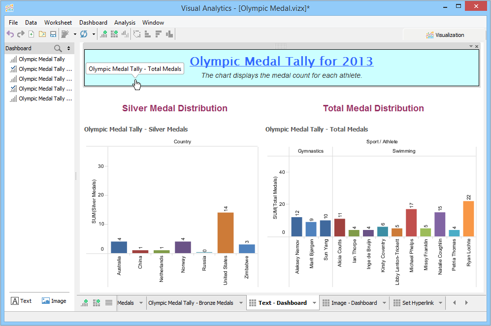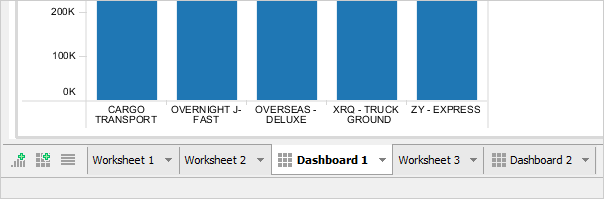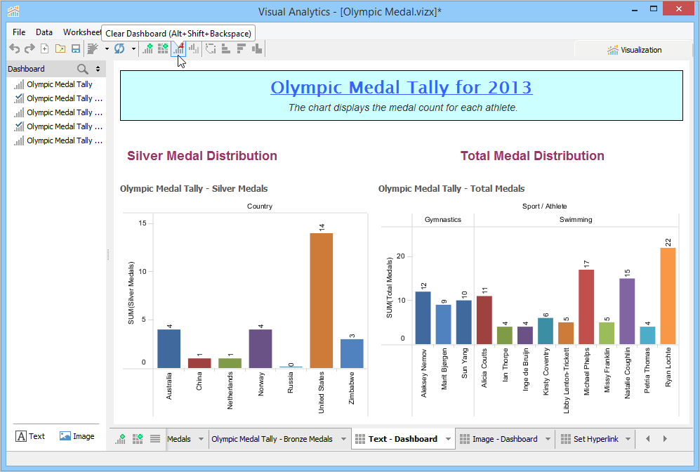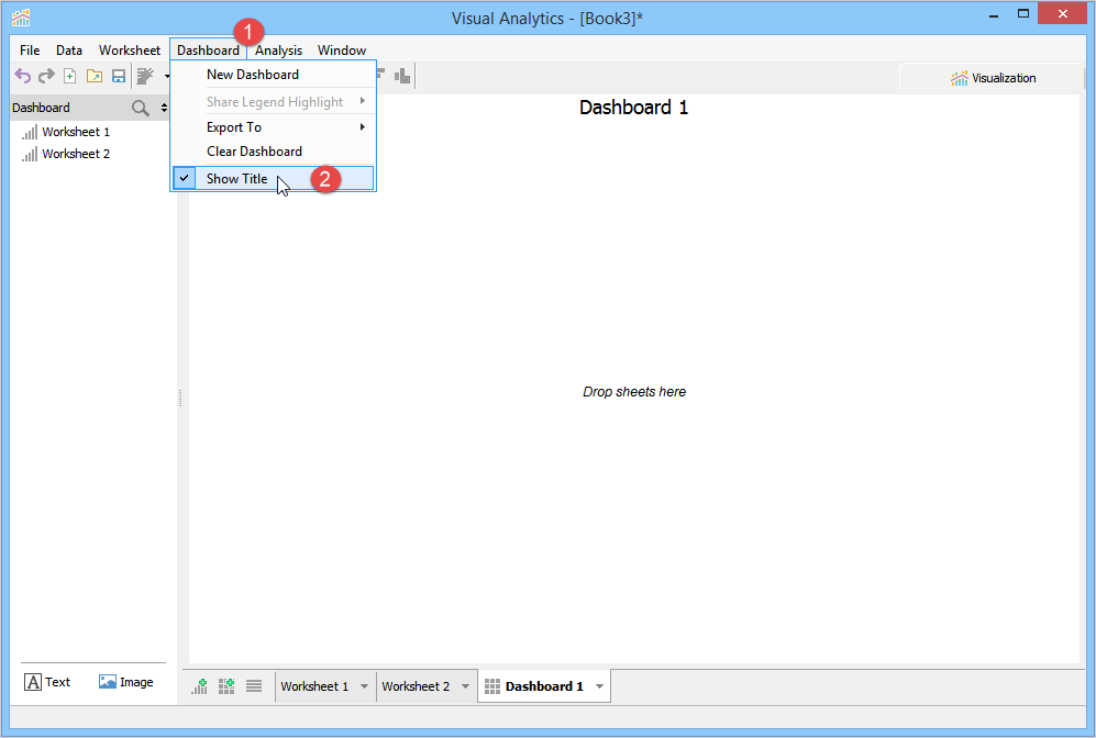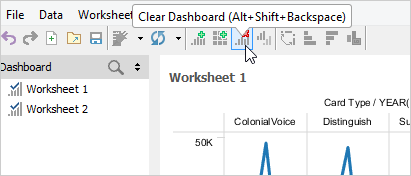 A Dashboard is a special sheet that can contain any combination of worksheets from your workbook, along with text and image objects. Dashboards are used primarily to display the view area from worksheets, where worksheets are used for editing and creating views. Using the text object, you can add notes, pointers or detailed descriptions for a worksheet. By using the image object, you can insert images from your computer or any web page.