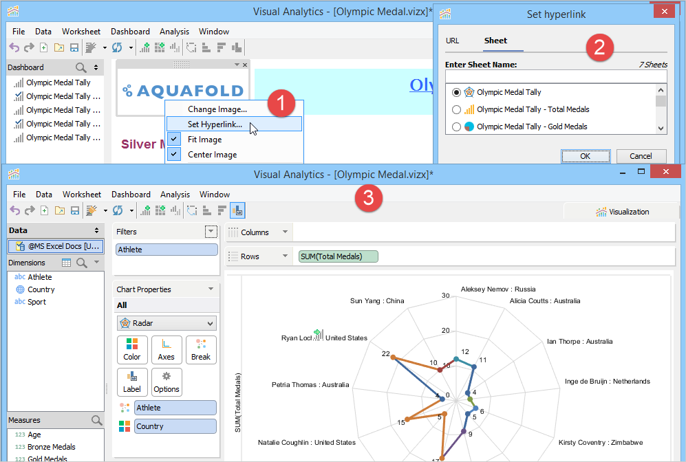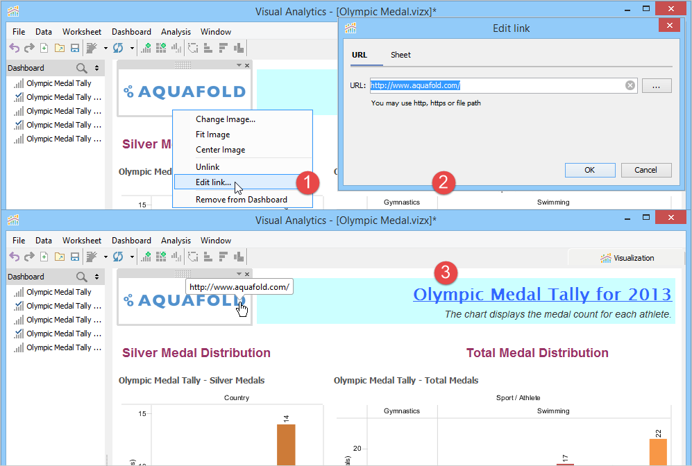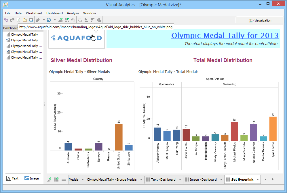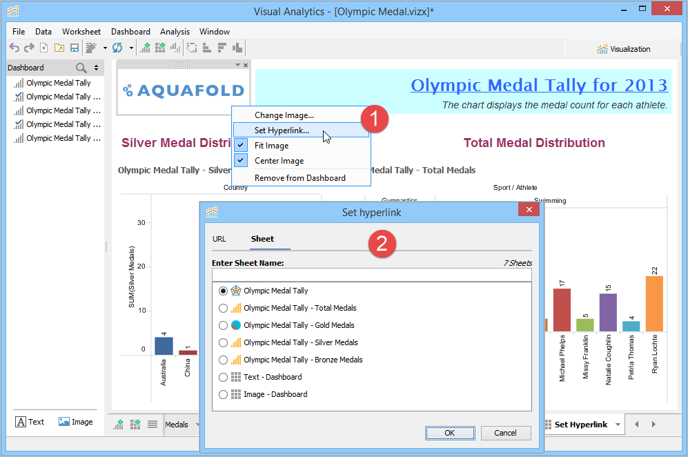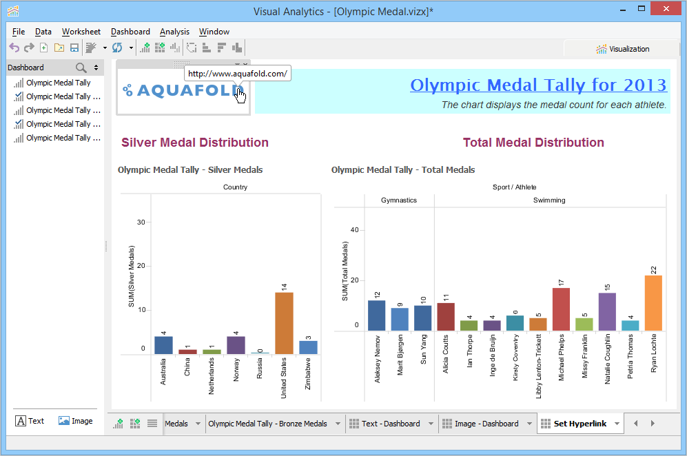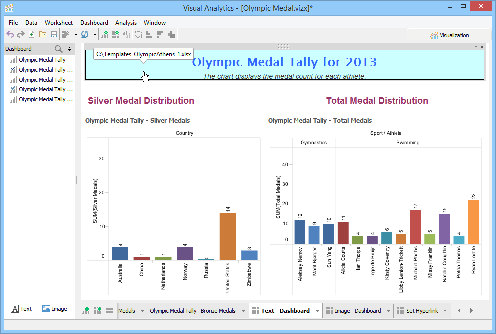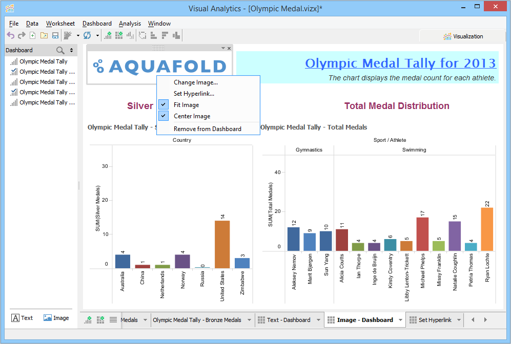 A Dashboard is a special sheet that can contain any combination of worksheets from your workbook, along with text and image objects. Dashboards are used primarily to display the view area from worksheets, where worksheets are used for editing and creating views. Using the text object, you can add notes, pointers or detailed descriptions for a worksheet. By using the image object, you can insert images from your computer or any web page.