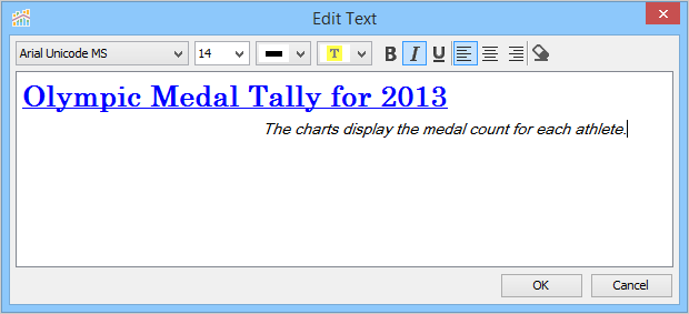 The Text Object gives you the ability to add, customize, and display text on your dashboard. The Edit Text option lets you add, change the font, size, and visual effects of the text.