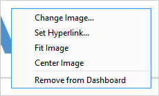 The Change Image option replaces the existing image on your Dashboard. The Fit Image option automatically scales the image to the size of the Image Object. The Center Image option aligns the image to the center of the Image Object. The Insert link option lets you link your image to a URL or a file on your computer or to a worksheet or another dashboard of the workbook.
