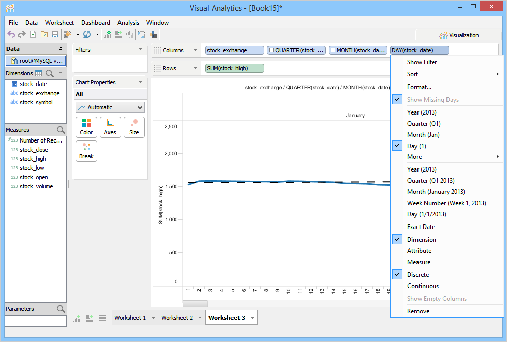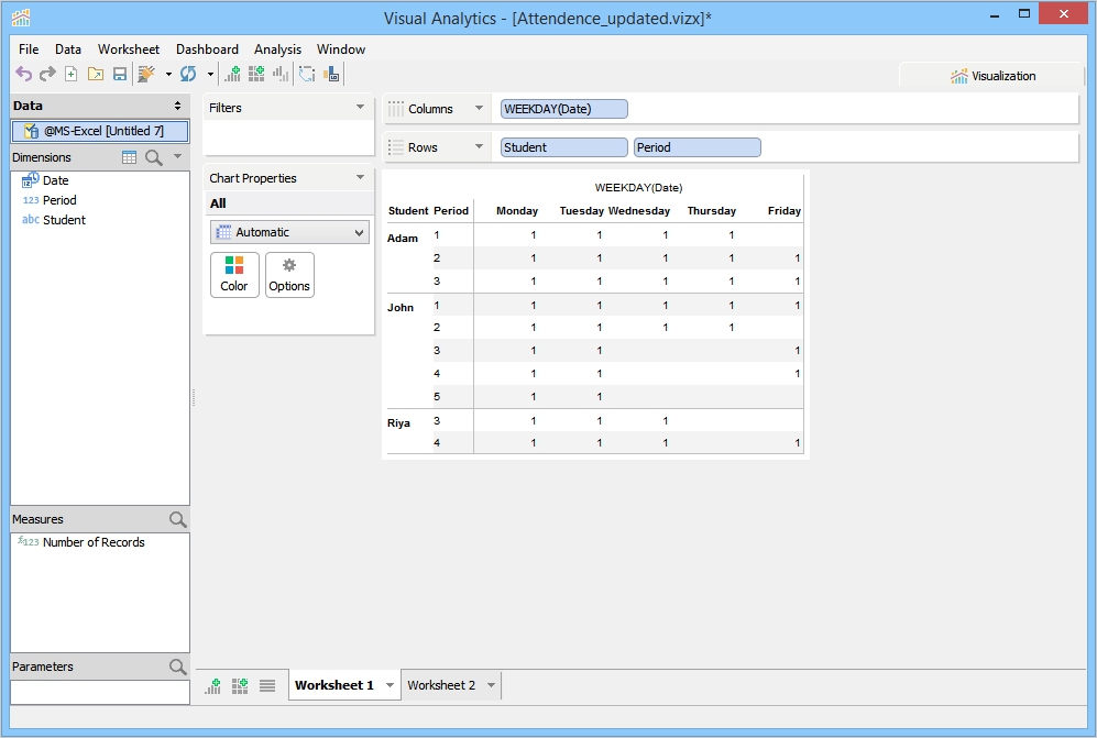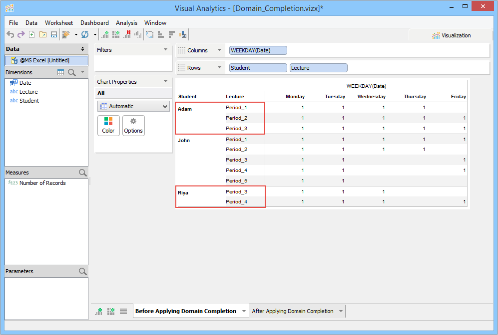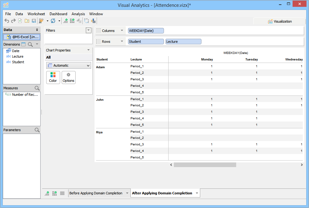 Domain Completion completes data by showing all available records for the specified dimension based on the unique values in your data set. Let’s consider a scenario where you want to compare the weekly attendance for each student of your class. Now, if a student does not attend a particular lecture for an entire week, the corresponding record might not be present in your data set. On applying domain completion on Period, Visual Analytics completes the record by displaying missing lectures for the students.