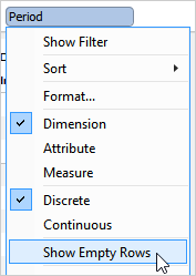 Show Empty Rows (Domain Completion) is available on right-click of a dimension.