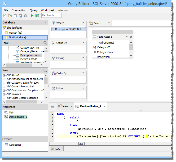 Derived Tables are in-memory tables you can create by combining columns and/or expressions from one or more tables and are treated just like a native database table in the Diagram and SQL Panes. There are a few methods of creating Derived Tables.
