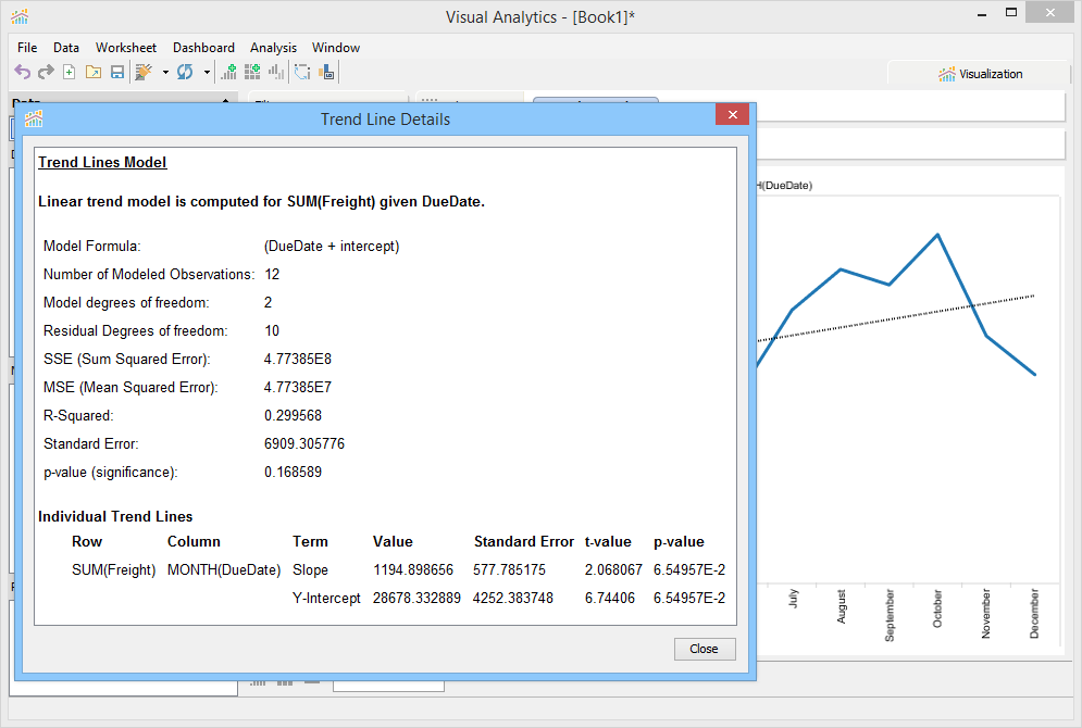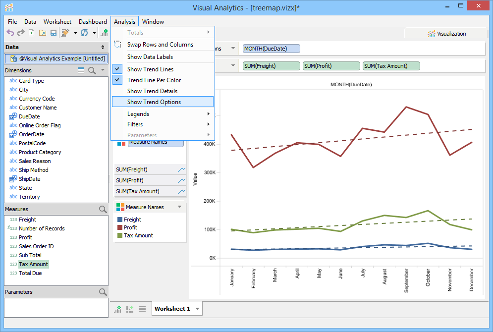 Trend Lines are lines that connect two or more points and then extend into the future to assist in detecting and predicting trends in time-series data. To display Trend Lines select [Analysis > Show Trend Lines]. Trend Lines display as black lines overlaid on the current view and are dashed when shown over Line Charts and solid when shown over bar charts to prevent confusing them with original chart content. You can also edit Trend Line Options with [Analysis > Trend Lines > Edit Trend Lines...] when [Analysis > Trend Lines > Show Trend Lines] is enabled.