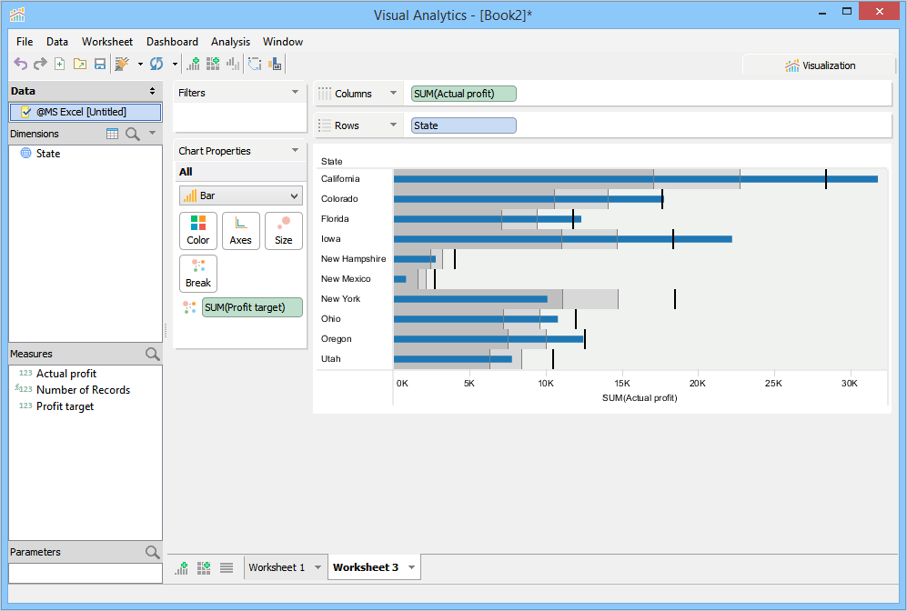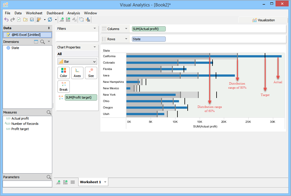 Visualization builds a Bullet Chart within the context of distribution ranges and reference lines. State forms the Y-axis, and Actual profit forms the X-axis. Visualization moves Profit target to the Break Deck. By default, Visualization plots a reference line. It places a line at the average value along the axis and shades between 60% and 80% goal completion. The reference line helps you to see how each state performed against the average.