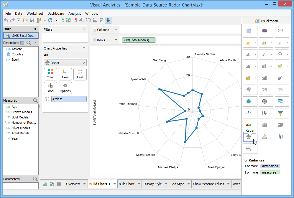 Visualization moves Athlete from the Columns Deck to the Break Deck. Visualization is displaying the athlete names on the chart. If you click the Label Deck, Show Category Labels are selected by default. As the data appears in a spider pattern, it is easy to interpret that Ryan Lochte dominates the medal tally.