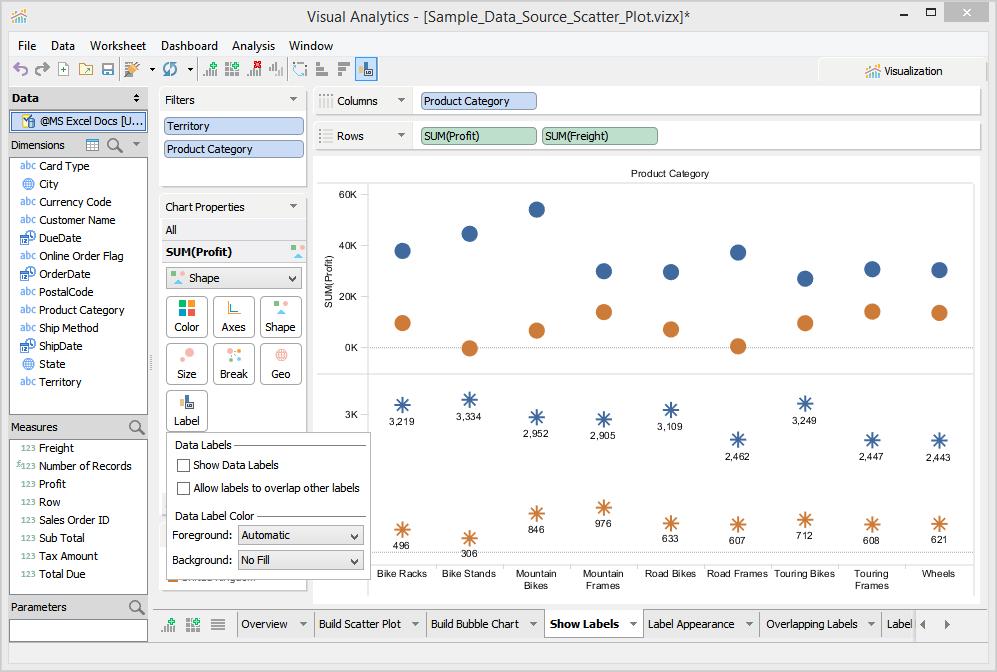 Download and connect to the sample data source. We are making this chart using 1 dimension and 2 measures.