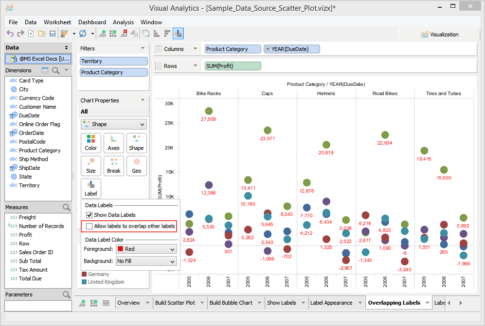 In dual axis and merged axes separate scale scenarios, the data labels will overlap each other, even when the check box is unselected. This is by design.