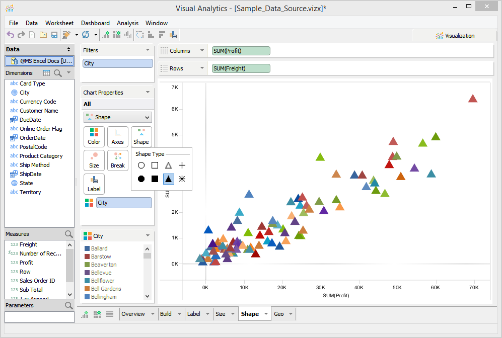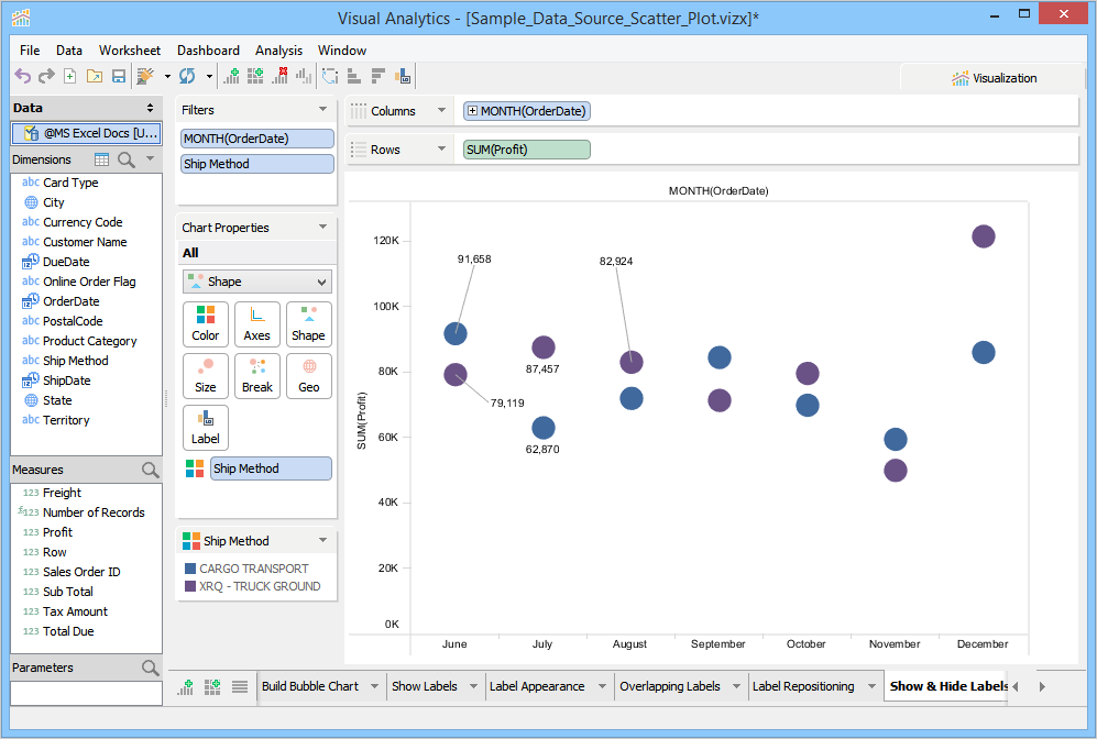 You will notice that Visualization moved Tax Amount to the Size Deck and ShipDate and Proft to the Rows Deck and Freight to the Column Deck. We have moved ShipDate to the Color Deck so that each year is displayed in a different color.