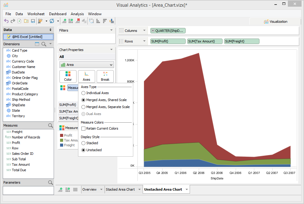 5. Select [Merged Axes] and [Unstacked] from Chart Properties Axes.