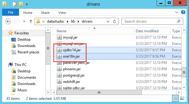 C:\Program Files\Aqua Data Studio 19.0 - 64bit\lib\drivers>dir 02/18/2017 08:58 AM <DIR> . 02/18/2017 08:58 AM <DIR> .. 02/18/2017 11:13 AM 35,701 cassandra-clientutil.jar 02/18/2017 11:13 AM 64,465 cassandra-jdbc.jar ... 02/18/2017 11:13 AM 445,188 ncluster.jar 02/18/2017 11:13 AM 4,036,257 ojdbc8.jar <- delete before paste 02/18/2017 11:13 AM 1,661,088 orai18n.jar <- delete before paste 02/18/2017 11:13 AM 346,944 paraccel-jdbc.jar 02/18/2017 11:13 AM 561,969 postgresql.jar 02/18/2017 11:13 AM 3,516,830 sqlite-jdbc.jar 02/18/2017 11:13 AM 286,773 util400.jar 02/18/2017 11:13 AM 262,740 xdb6.jar 02/18/2017 11:13 AM 839,982 xmlparserv2.jar 28 File(s) 29,365,764 bytes 2 Dir(s) 88,341,790,720 bytes free C:\Program Files\Aqua Data Studio 19.0 - 64bit\lib\drivers> |