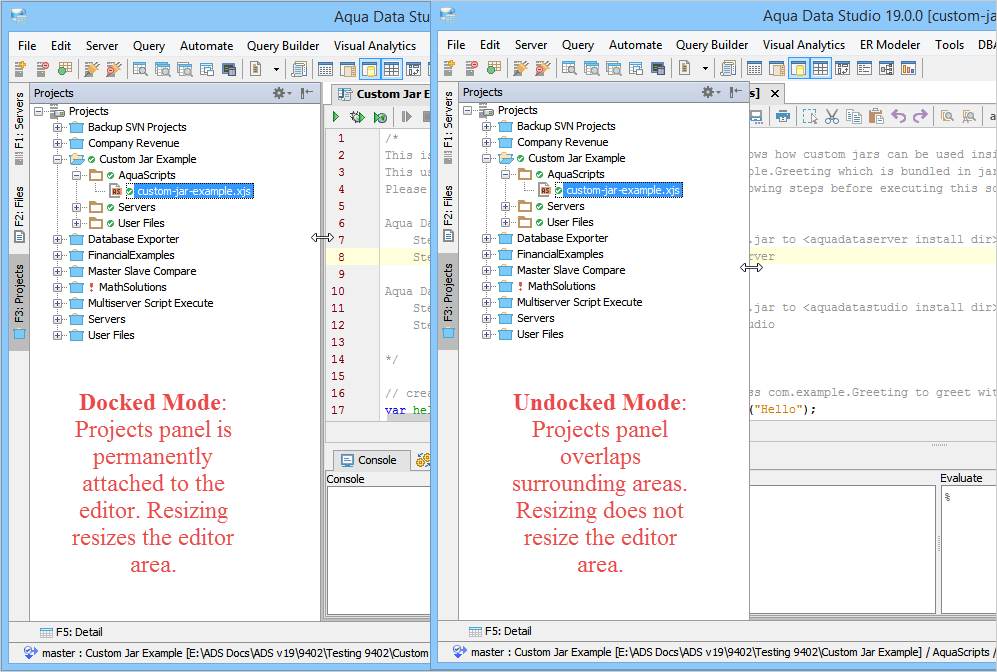 Dockable panels are supported in the following areas of Aqua Data Studio: