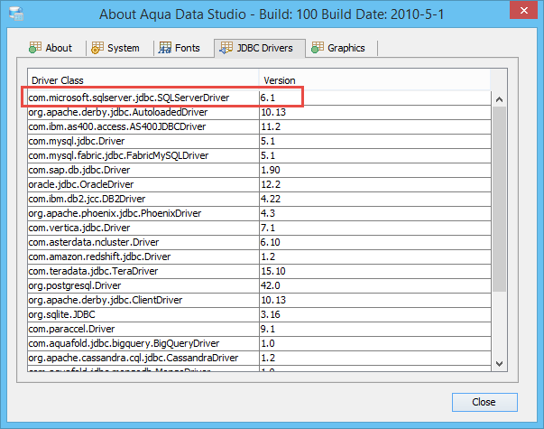 The SQL Server (v6.1) drivers included with Aqua Data Studio work across all versions of Microsoft SQL Server. Microsoft SQL Server releases are very frequent, and may sometimes require updating the JDBC driver.