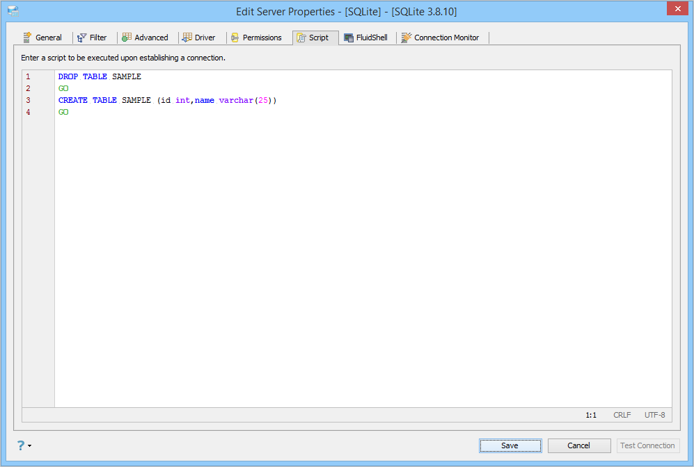 Edit Scripts in Server Properties in Aqua Data Studio: